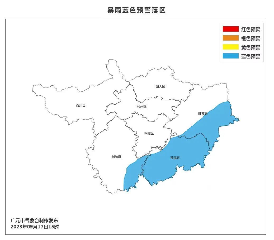 9月17日下午,广元发布山洪和地质灾害气象预警。苍溪县、旺苍县、剑阁县乡镇需要提高防范。