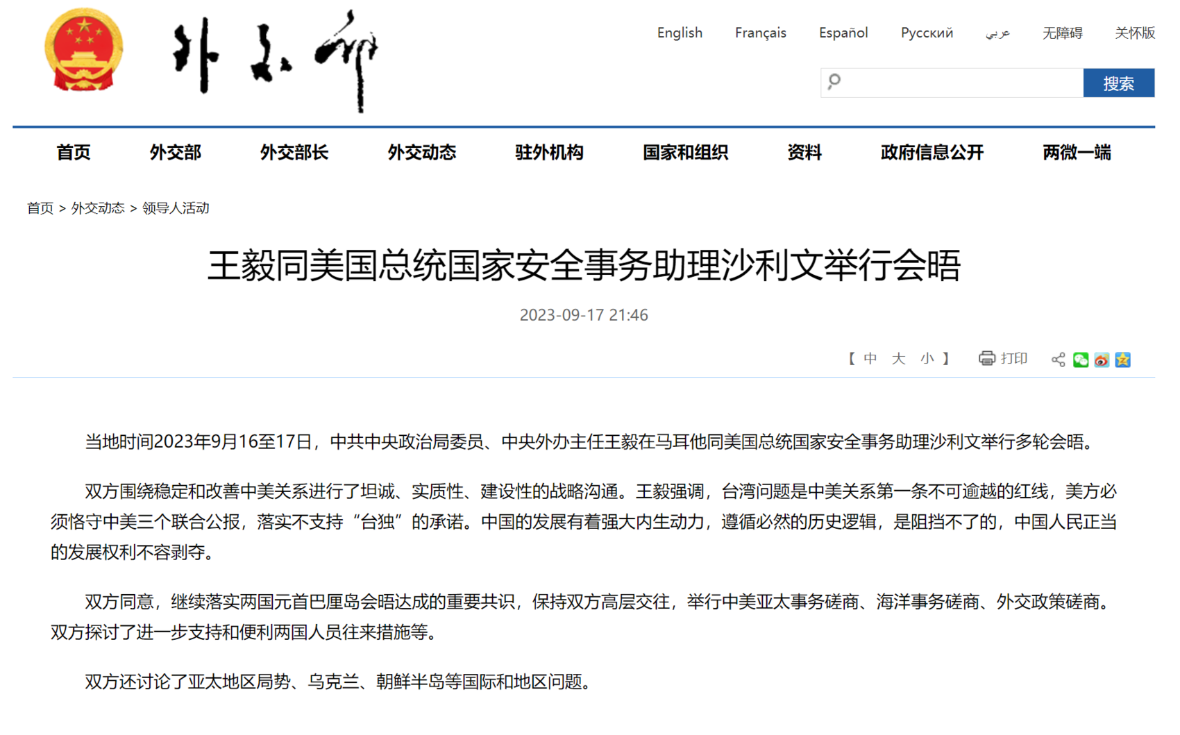 当地时间2023年9月16至17日,中共中央政治局委员、中央外办主任王毅在马耳他同美国总统国家安全事务助理沙利文举行多轮会晤。