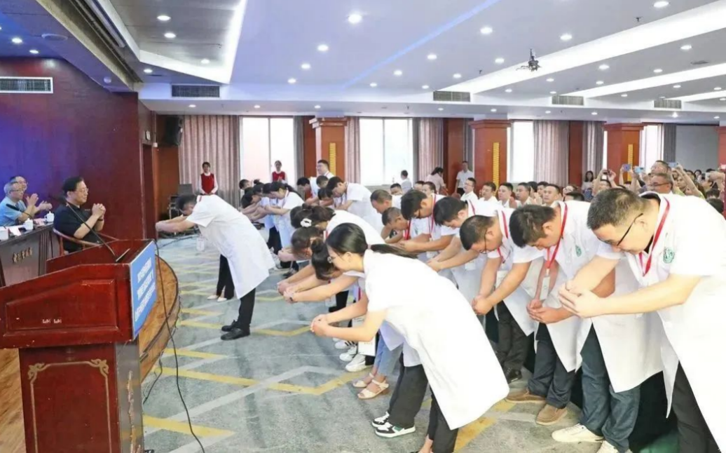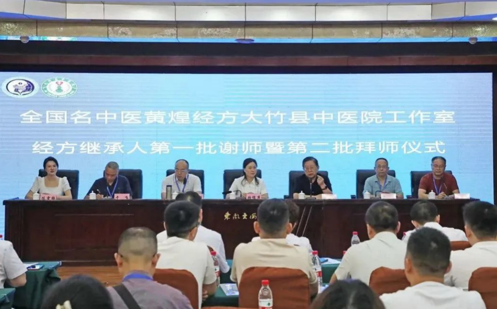 在热烈的气氛中,全国名中医、南京中医药大学国际经方学院院长黄煌教授将工作室牌匾递交大竹县中医院党委副书记、院长陈雪梅手中,大竹县名中医团队培育项目全体学员和经方工作室的全体学员集体向黄煌教授鞠躬拜师。