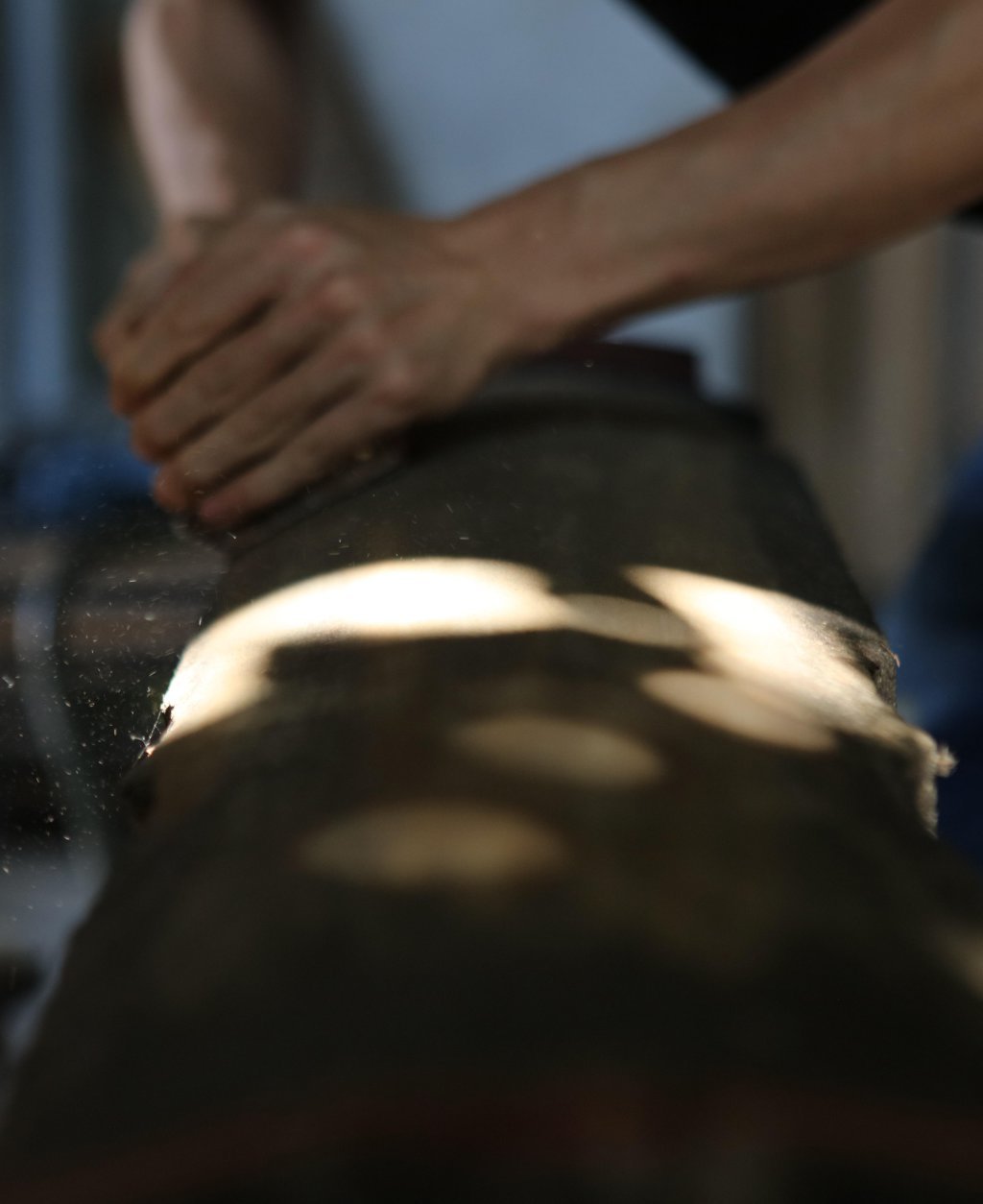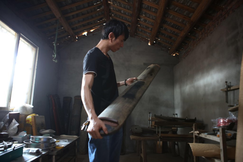 弹奏这古琴的,正是邓天。小院里工作台上摆着十余种制作古琴的工具,铅笔、锯凿、刻刀等。此时的邓天正手持工具,手法娴熟地给古琴毛坯一遍遍地刷上“灰胎”。