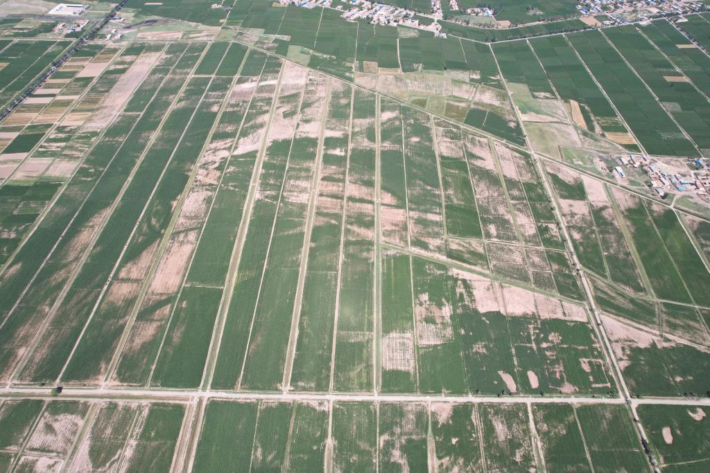平罗县一处盐碱地典型区域,白色裸露部分为农作物难以生长的重度盐碱地(2023年7月摄)。(平罗县农业农村局供图)