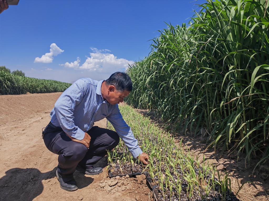 高级农艺师周兴德向记者介绍巨菌草幼苗(2023年9月1日摄)。新华社记者马丽娟 摄
