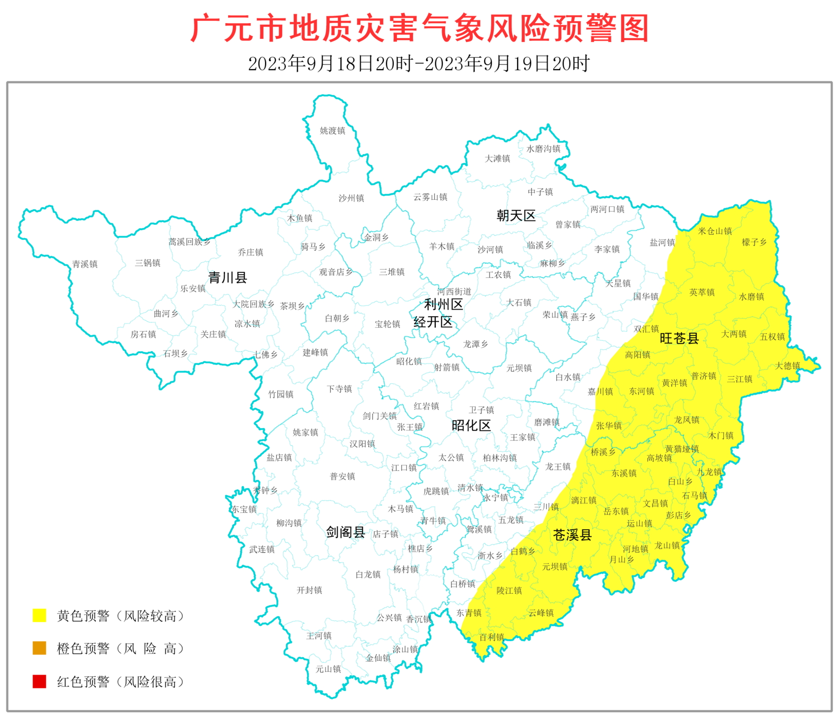 9月18日17时,广元市地质灾害指挥部办公室发布地质灾害气象风险预警,9月18日20时-9月19日20时,苍溪县陵江镇等29个乡镇、旺苍县东河镇等20个乡镇发生地质灾害的风险较高(黄色预警)。