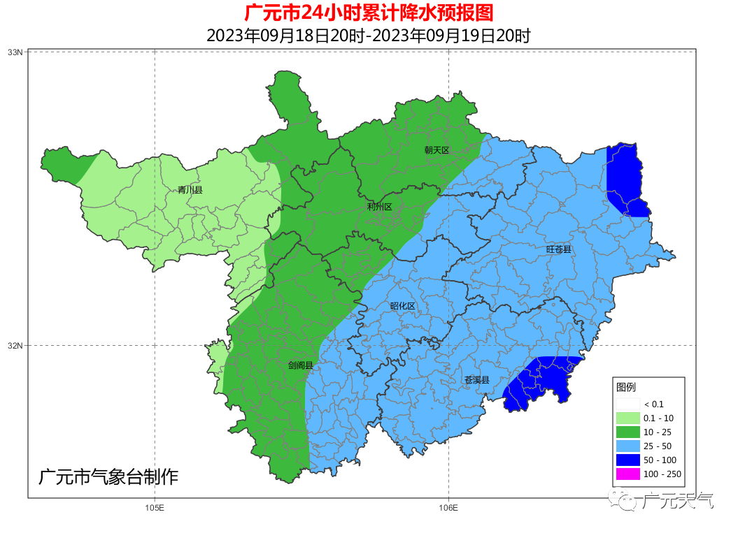 9月18日下午,广元市气象台发布最新天气预报,预计今天晚上到明天白天 ,广元全市阴天有阵雨或雷雨,中东部有中到大雨,旺苍县和苍溪县局部地方有暴雨,过程中可能伴有雷电、短时强降水、阵性大风等强对流天气。