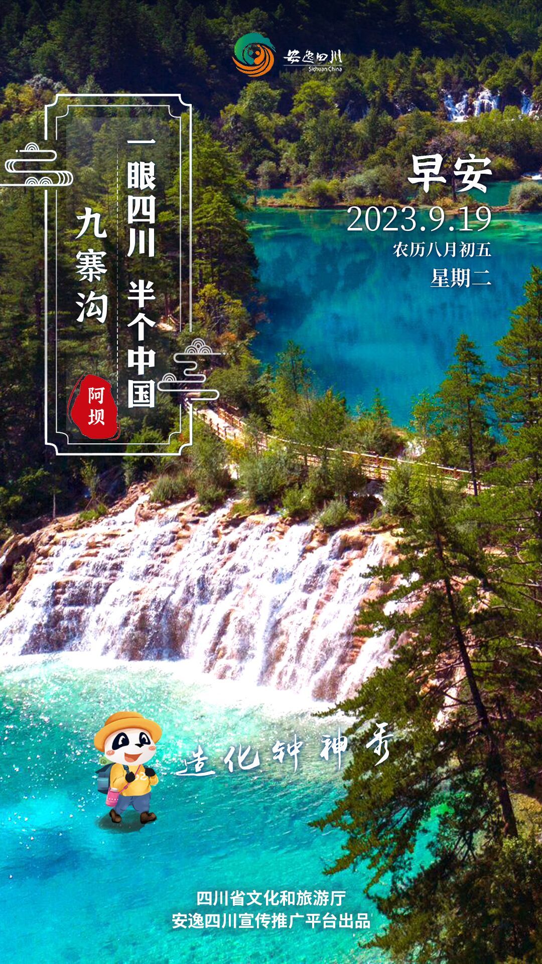 9月19日,星期二。今日安逸四川日历海报“一眼四川 半个中国”之旅走进世界自然遗产九寨沟。