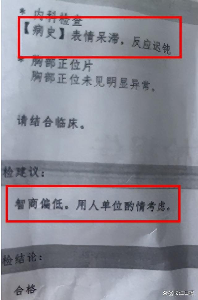 9月12日,网传视频显示,一份入职体检报告上,内科检查一栏写着“(病史)表情呆滞,反应迟钝”字样,在体检建议一栏还写着“智商偏低,用人单位酌情考虑”的内容,落款盖有连云港徐圩新区人民医院体检中心公章。视频配文称:“一个朋友智力有问题,医院也很负责,做个入职体检,这是医院对工作及招工公司的一种责任……”而在胸部正位片一栏则完全正常,最终的体检结论也是合格。