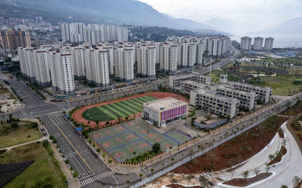 这是9月18日拍摄的位于巧家县城的白鹤滩水电站移民搬迁安置楼房及配套的立鹤小学(无人机照片)。
