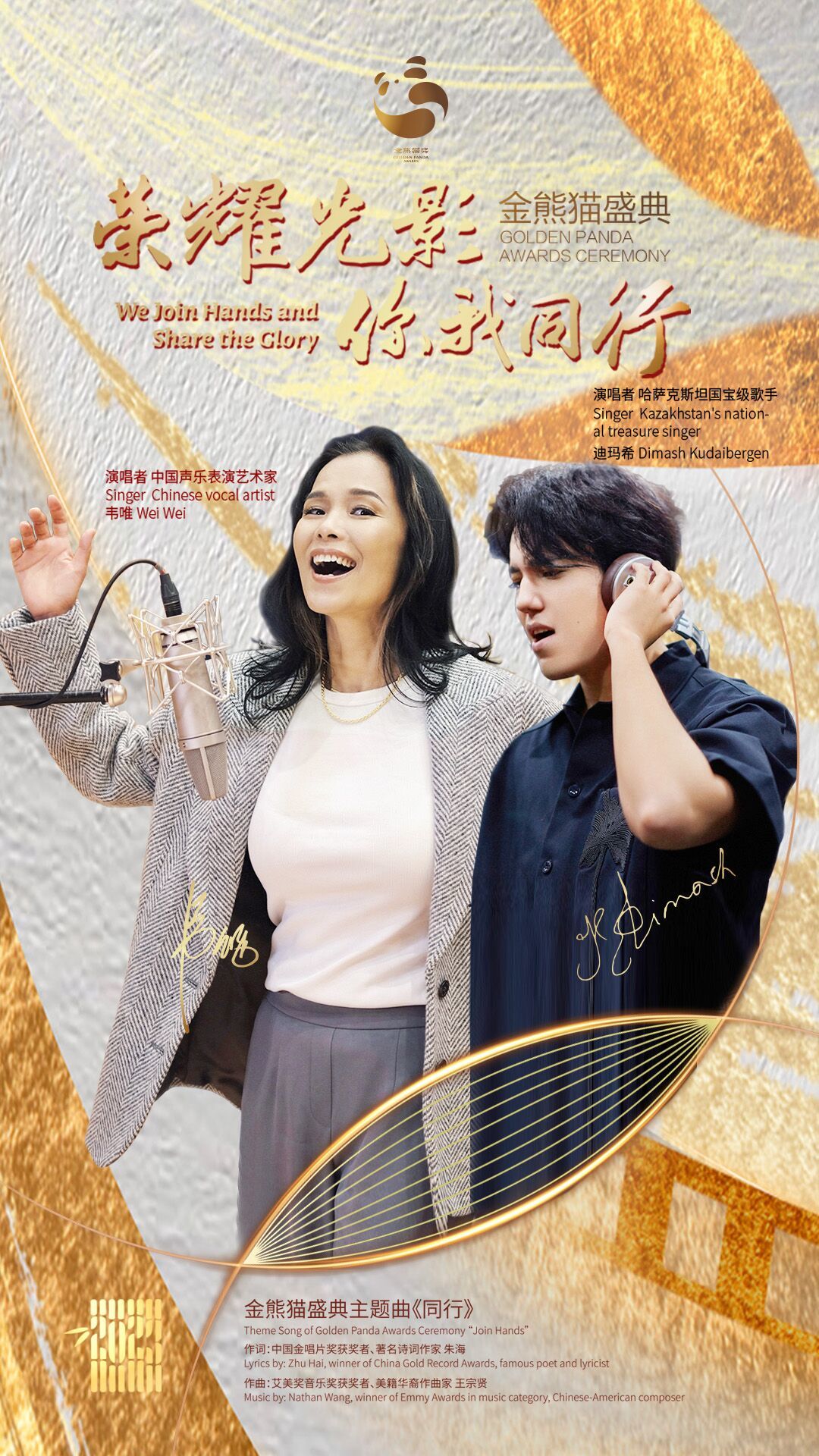 “光影的世界,有你有我,何不同行。”9月19日,金熊猫奖原创主题曲《同行》正式全网首发,中国著名女歌手韦唯和哈萨克斯坦人气歌手迪玛希共同献唱。