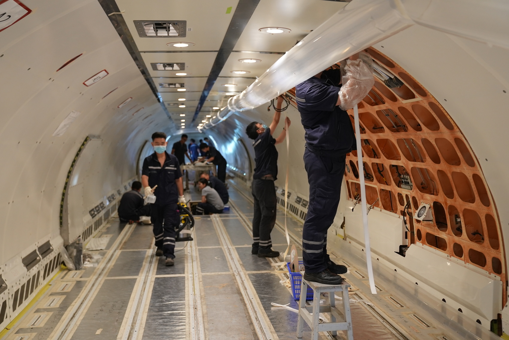 走进飞机内部就能听见轰鸣声,机舱里的座椅已经全部搬空,身穿反光背心的工作人员正在进行货舱的搭建工作。