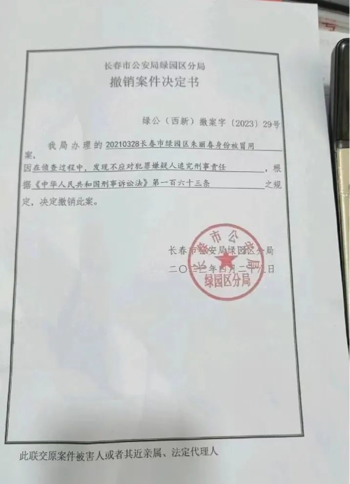 2023年4月28日,朱丽春得知此案已被撤销,在长春市公安局绿园分局给她的《撤销案件决定书》中写道:我局办理的20210328长春市绿园区朱丽春身份被冒用案,因在侦查过程中,发现不应对犯罪嫌疑人追究刑事责任,根据《中华人民共和国刑事诉讼法》第一百六十三条之规定,决定撤销此案。