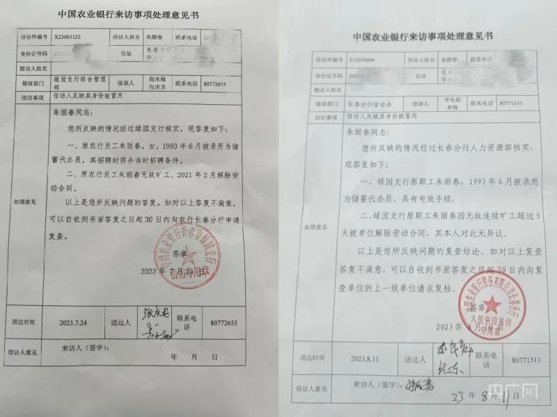 朱丽春两次收到的《处理意见书》,分别由中国农业银行长春市绿园支行和长春分行出具(央广网发 朱丽春供图)