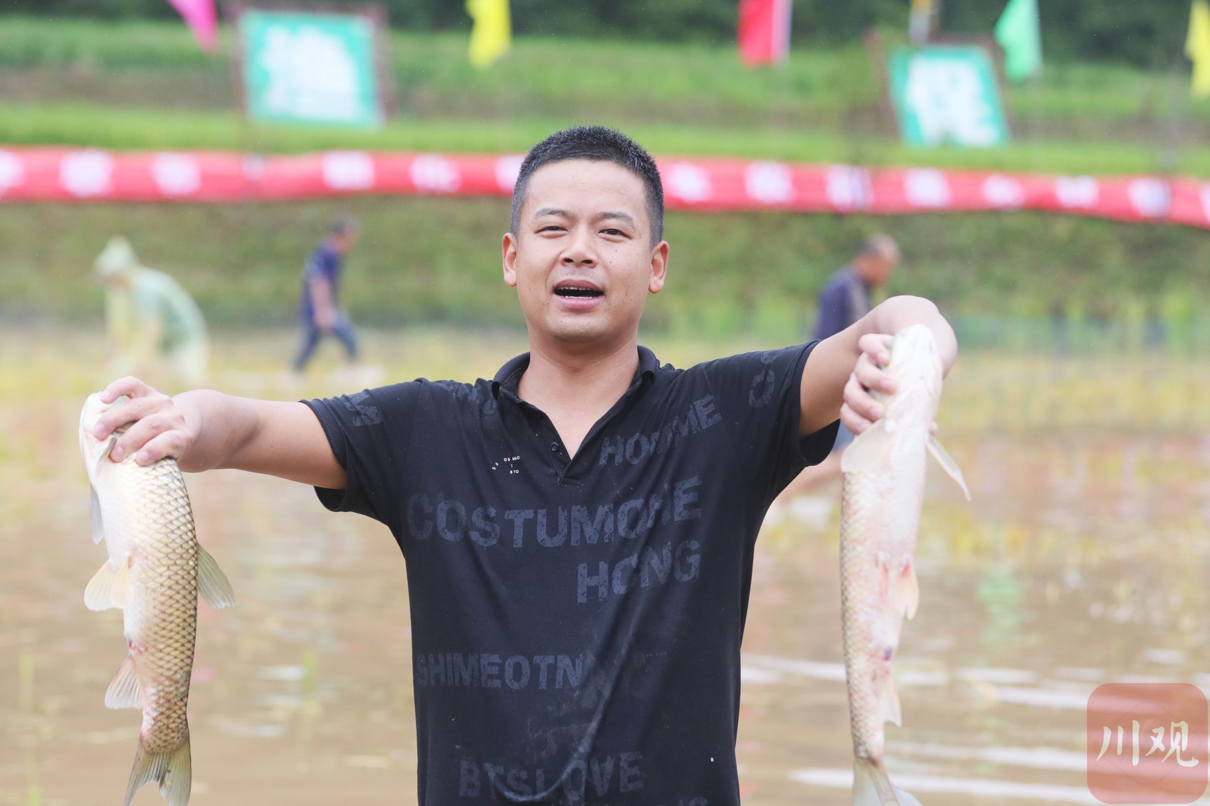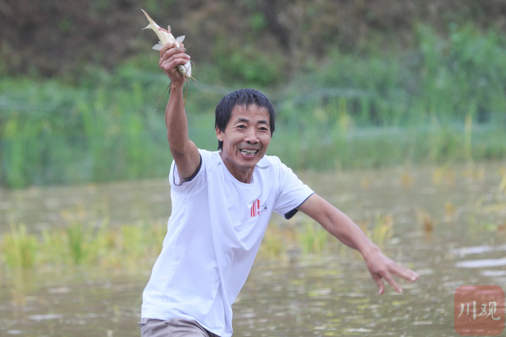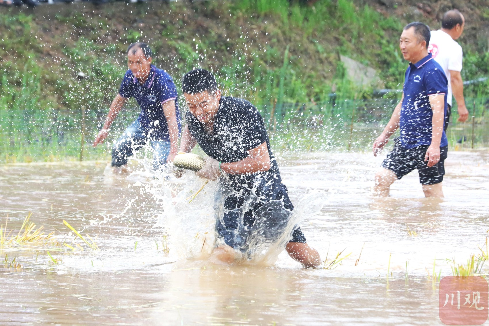 “这里有条鱼,快来,不要让它跑了!”随着一声哨响,来自昭化区各镇的稻田抓鱼代表队和游客挽起裤脚,争先恐后地跳进稻田,比拼起抓鱼技能。稻田里,选手们你追我赶,忙得不亦乐乎;田埂上,观众呐喊助威,欢笑声不绝。