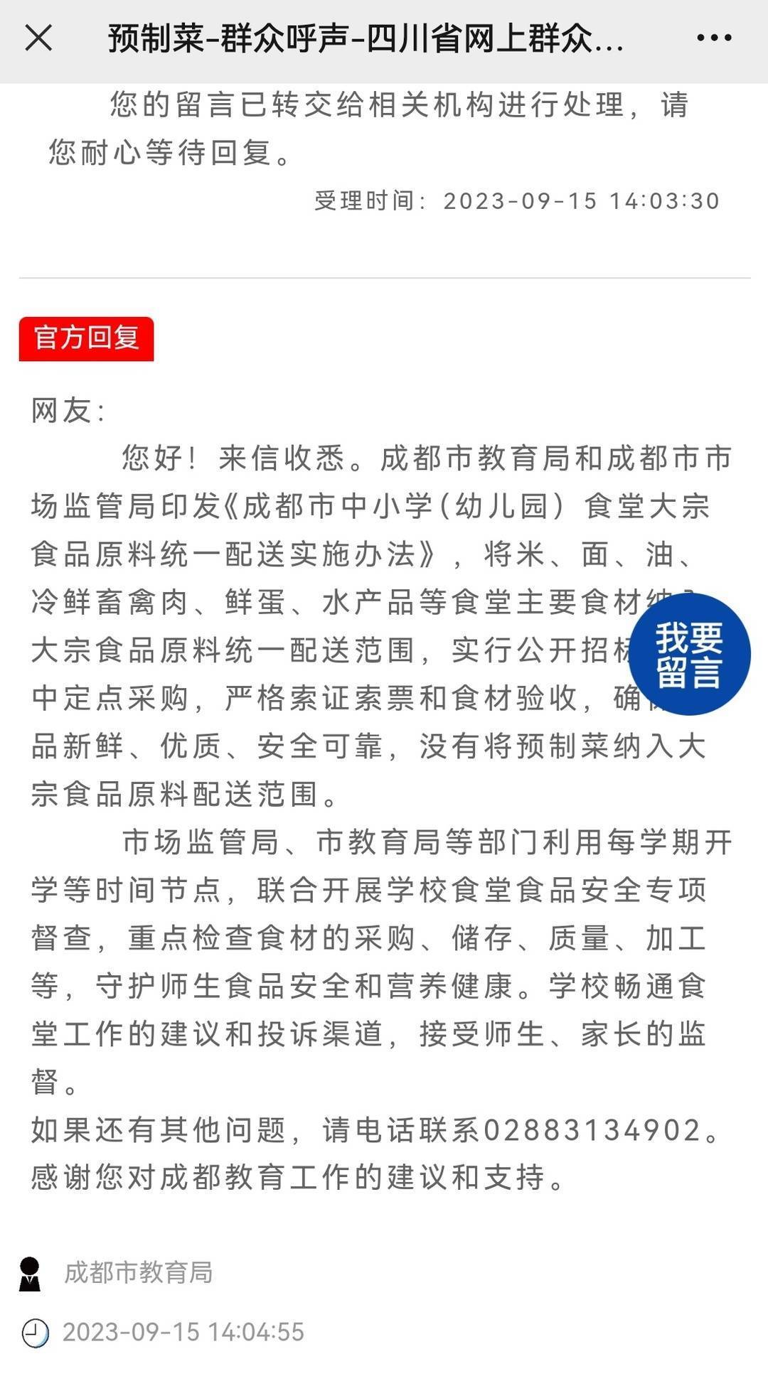 成都市教育局在公开回复网友中表示,成都市教育局和成都市市场监管局印发《成都市中小学(幼儿园)食堂大宗食品原料统一配送实施办法》,将米、面、油、冷鲜畜禽肉、鲜蛋、水产品等食堂主要食材纳入大宗食品原料统一配送范围,实行公开招标,集中定点采购,严格索证索票和食材验收,确保食品新鲜、优质、安全可靠,没有将预制菜纳入大宗食品原料配送范围。