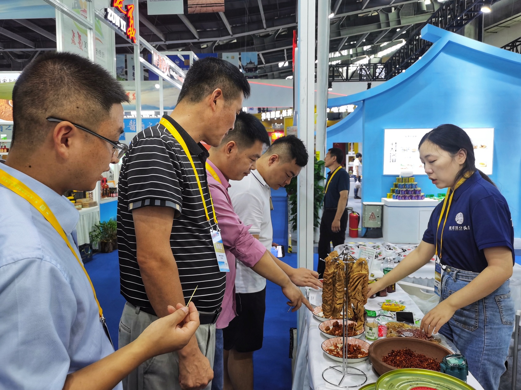 “老板,您这个辣椒面是吃烧烤的辣椒面不?”一位来自北京的展商武先生特地逛到贵州的展区里来买辣椒面。“我们昨晚在泸州吃了烧烤,那个辣椒面特别好吃,所以今天打算来买点带回家尝尝。”武先生右手接过老板递来的辣椒面,左手是已经买好的满满一大袋,里面装着冷吃兔、火腿、牛肉丝等特色美食。