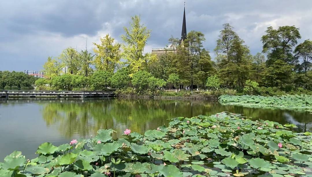 成都南湖公园内,有人在凉亭内休憩闲聊,有人在教堂外拍摄婚纱照,还有人站在绿荫下欣赏着湖中的荷花……大家惬意享受着公园内美好的午后时光。
