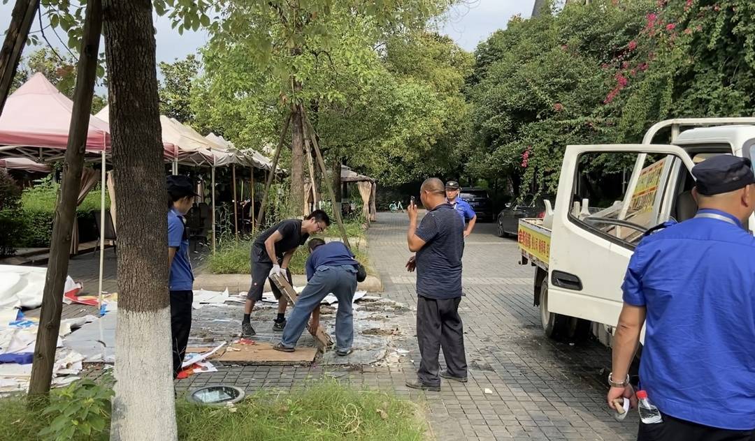 另外在不远处,几名工人把刚拆卸下来的违建杂物一件件搬上运渣车。“这一片终于敞亮起来!以前这个位置基本被商家们围挡起来,给游园的市民带来了很多不便。”华阳街道综合执法协调办相关负责人表示,对南湖公园公共区域占地经营整治是此次街道接管后的重要任务之一。“这十多天里,我们已经清理了26家占用公区进行经营的商家。”