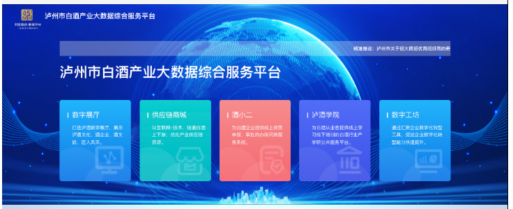 泸州市自2022年启动全国首个白酒全产业链数字化综合服务平台建设。该平台按照全要素数字化汇聚、全链条数字化融合、全主体数字化赋能”建设理念,以“一库七场景六大功能”建设为核心,赋能“政、企、行、产、学、研”等多元主体,助力泸州市白酒产业数字化转型升级。