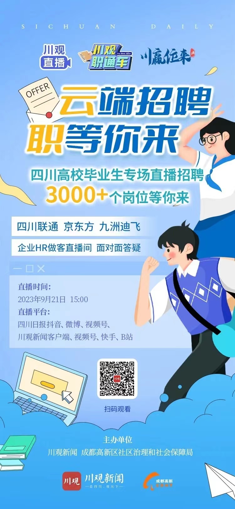 9月21日下午3:00,四川日报川观职通车联合成都高新区社区治理和社会保障局推出首场四川高校毕业生专场直播招聘会,3000+个高新企业岗位“虚位以待”,同时还有四川联通、京东方、九洲迪飞等三家企业HR做客直播间在线答疑。