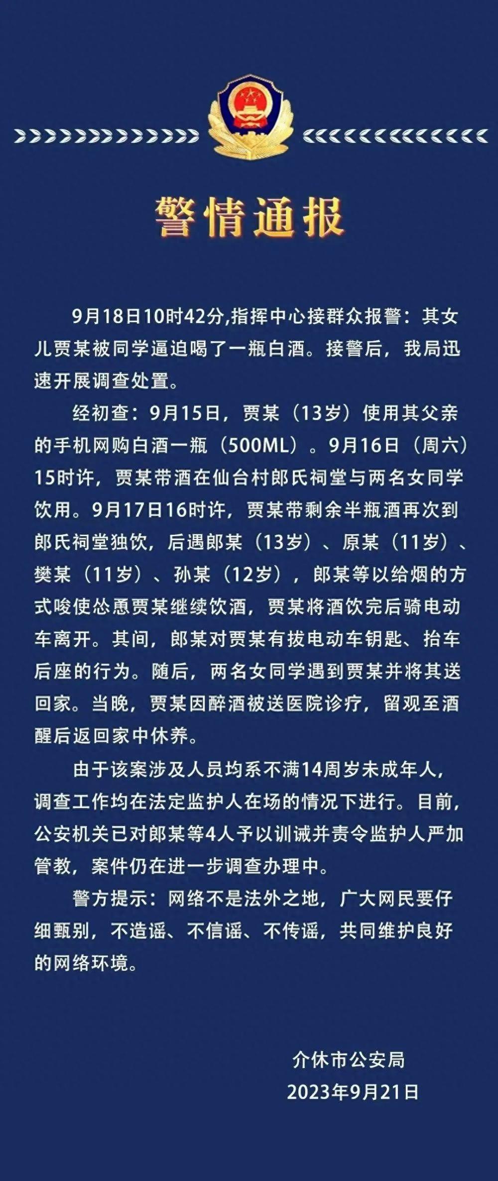 通报称,9月18日10时42分,指挥中心接群众报警:其女儿贾某被同学逼迫喝了一瓶白酒。接警后,介休市公安局迅速开展调查处置。