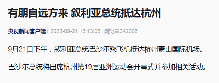 巴沙尔总统将出席杭州第19届亚洲运动会开幕式并参加相关活动。
