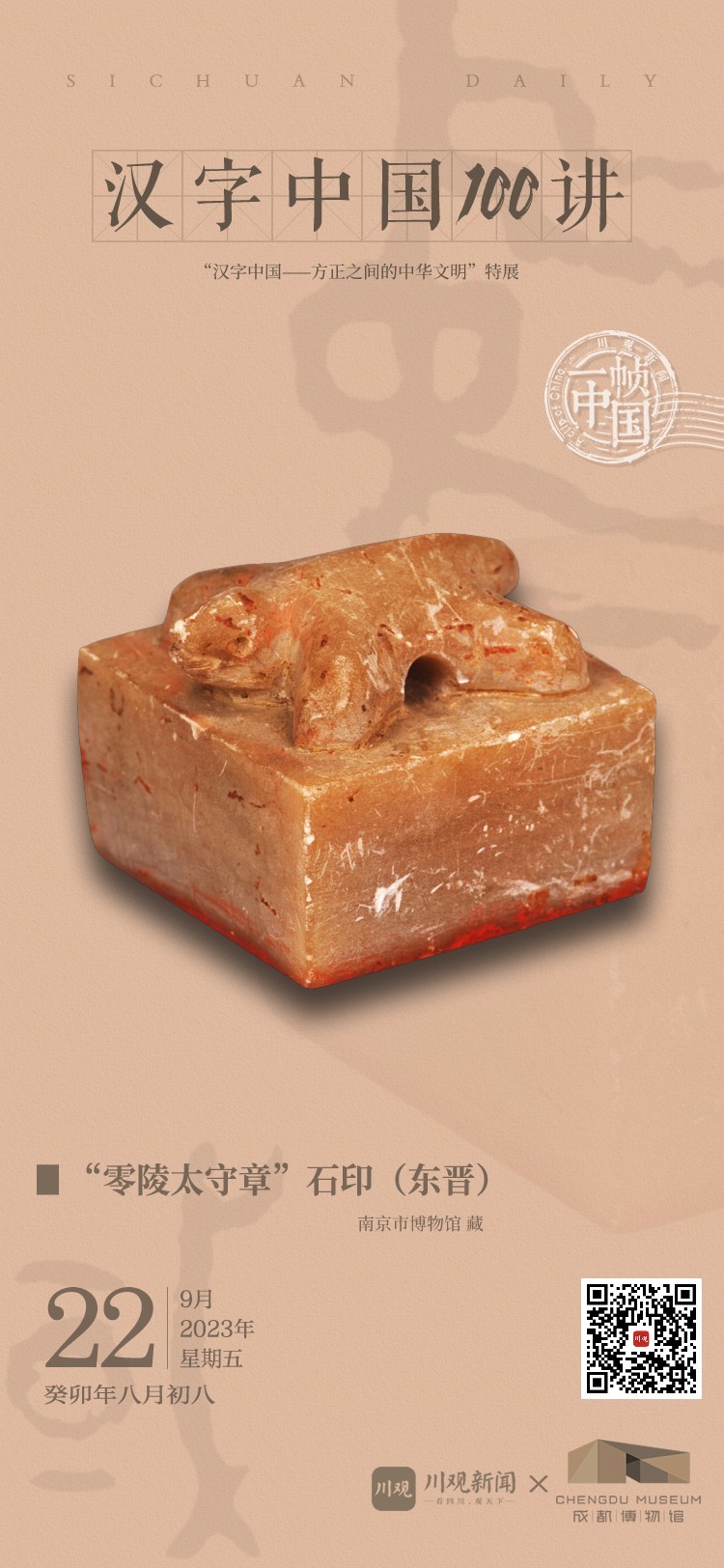 “零陵太守章”石印为石质、方形,印的上方有龟钮。这枚石印以“章”字入印,开创了后世官印印文的先河;同时,“零陵太守章”石印以隶书入印,打破了印文字体唯有篆书的限制,石印印文方拙古朴、气势雄健、姿态横生,为后世印章字体的丰富化和艺术化做了大胆的尝试。