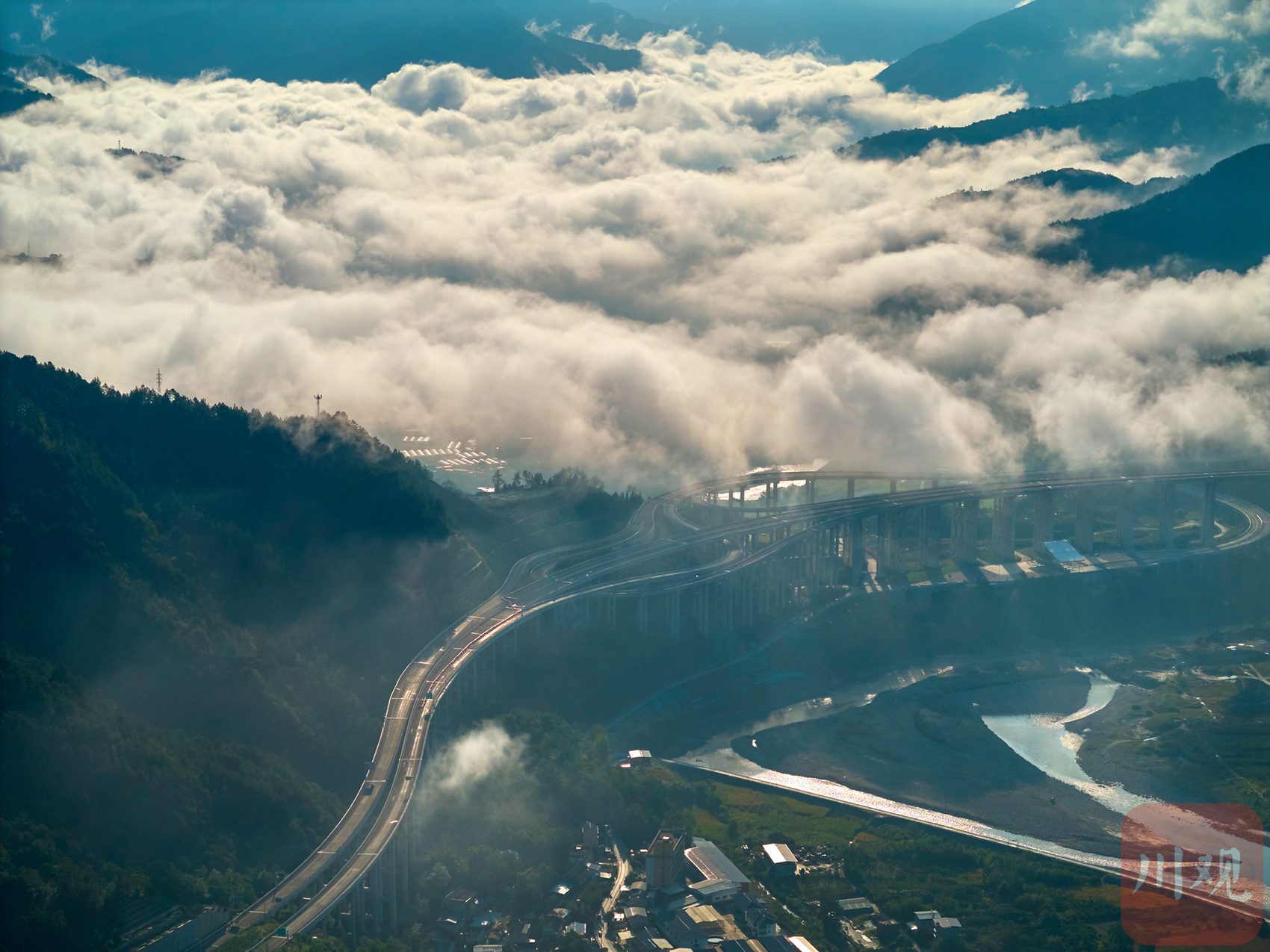 近日,一场秋雨后天气放晴,山间云雾缭绕,九绵高速公路平武互通大桥若隐若现,连绵的群山蜿蜒起伏,缥缈的云雾在山间、高速公路、和村落间升腾翻滚,变幻多姿,美不胜收。