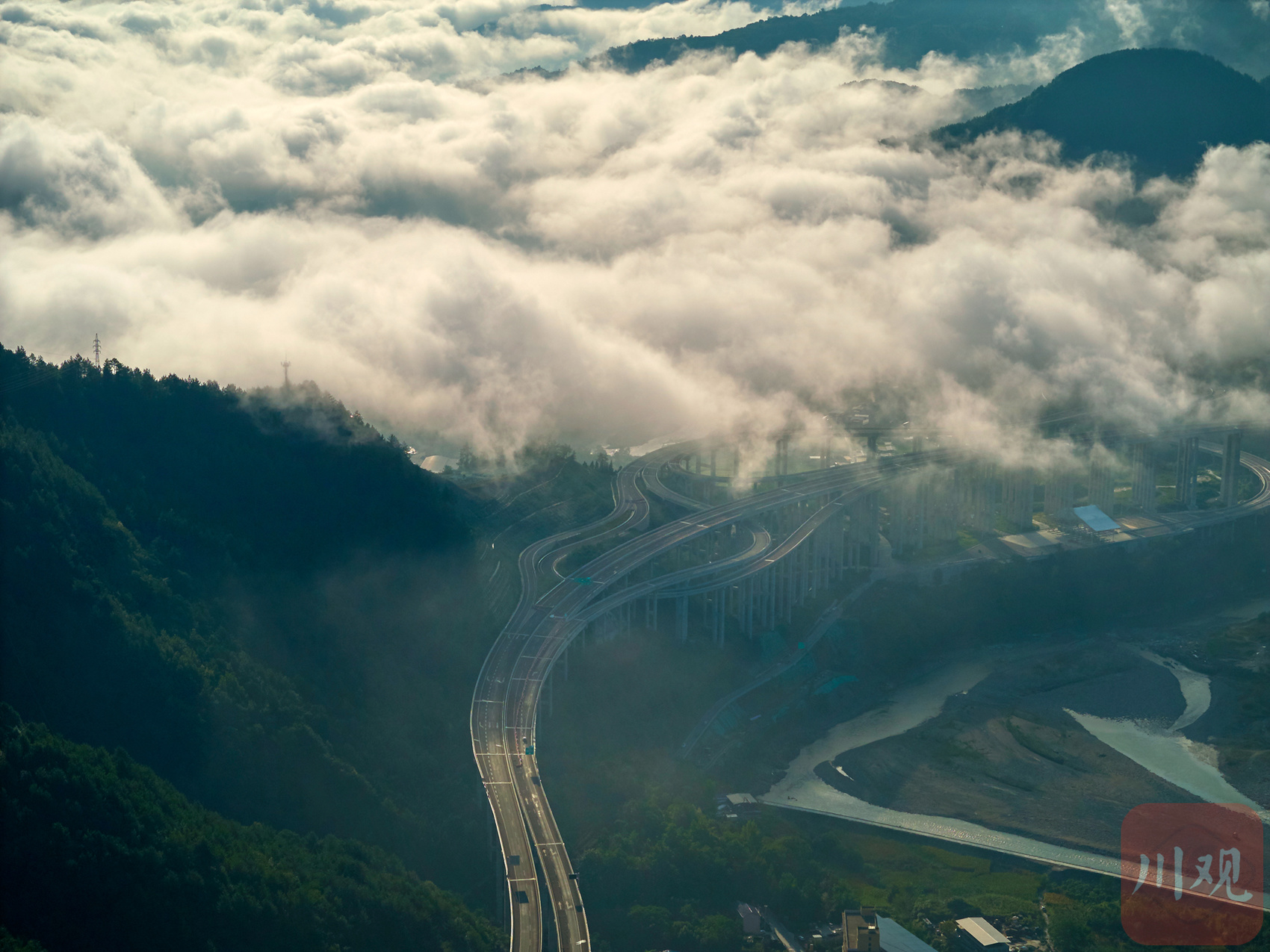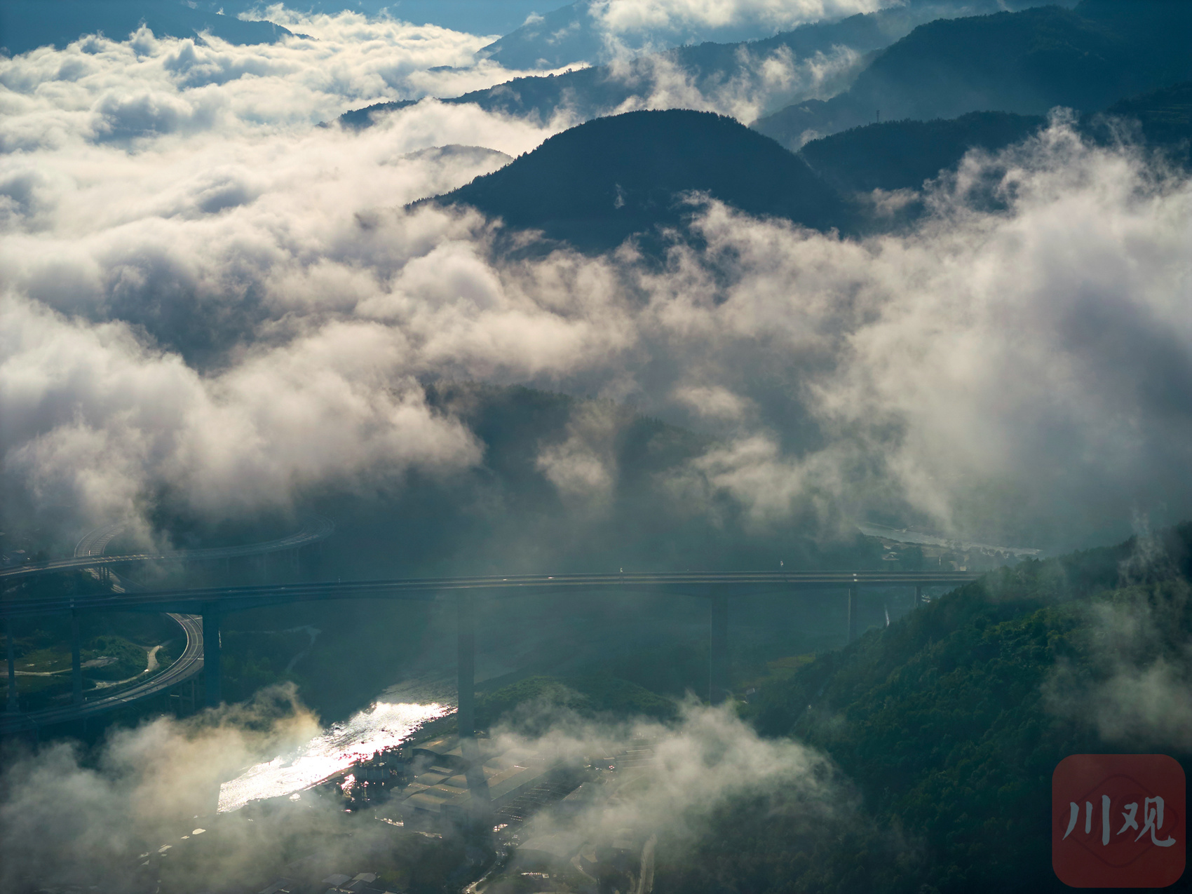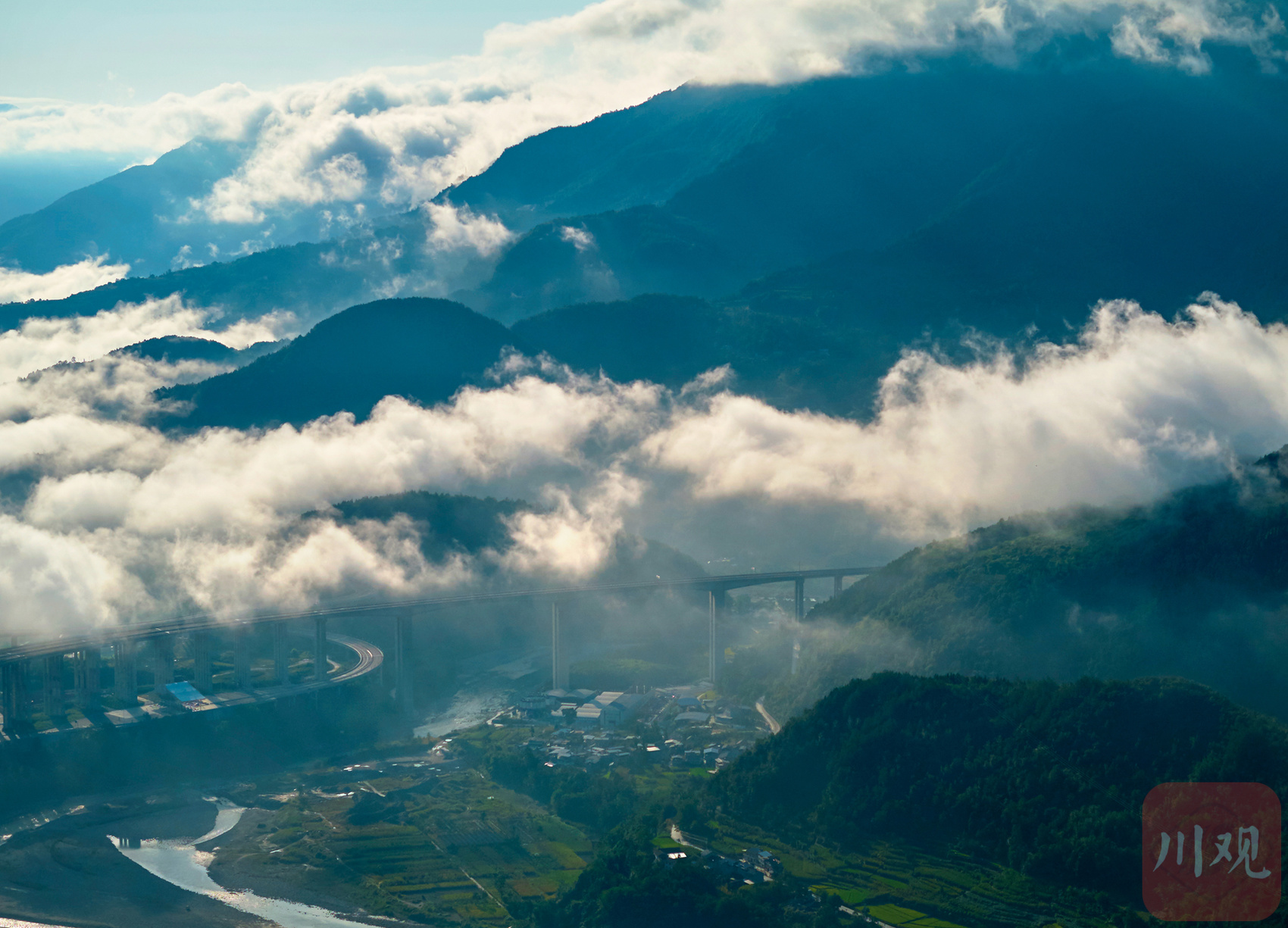 透过山间云雾从高空鸟瞰,横跨涪江的九绵高速平武互通大桥,宛若仙境中的一条巨龙,矗立在群山河谷之间。高速公路在云雾中穿梭,沿途的青山绿水与若隐若现的云雾交相辉映,呈现出一幅壮美的山水画卷,让人心旷神怡。