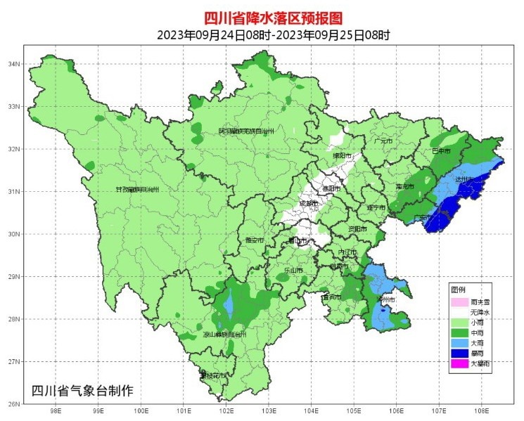 24日白天到晚上,盆地各市阴天间多云有分散小雨或阵雨,其中达州、广安、巴中、南充、泸州、宜宾6市有中雨,局部大雨到暴雨;川西高原和攀西地区阴天间多云有阵雨或雷雨,局部中到大雨。