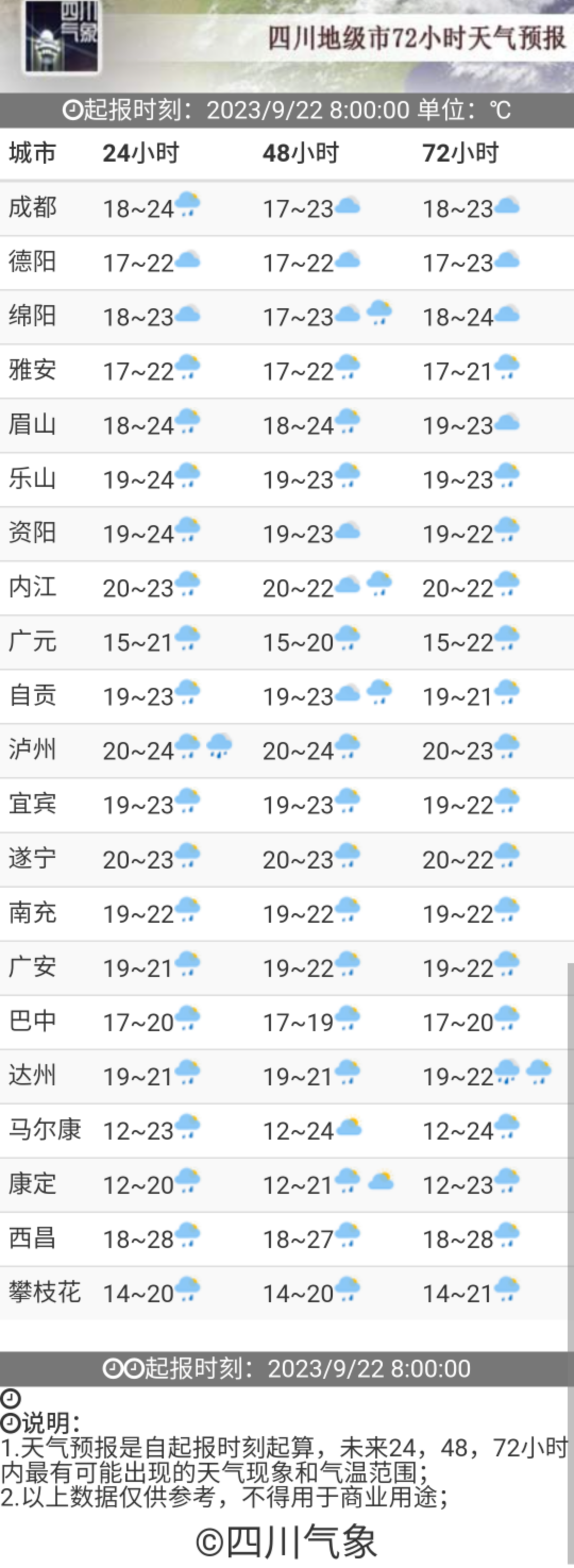 预计9月下旬,四川大部地方雨日较多,23日至25日和27日至28日分别有一次降水天气过程,局地强度较大,其中24日至25日盆地东北部和攀西地区有中到大雨,局部暴雨。
