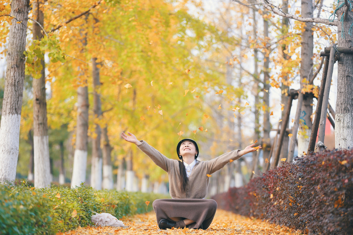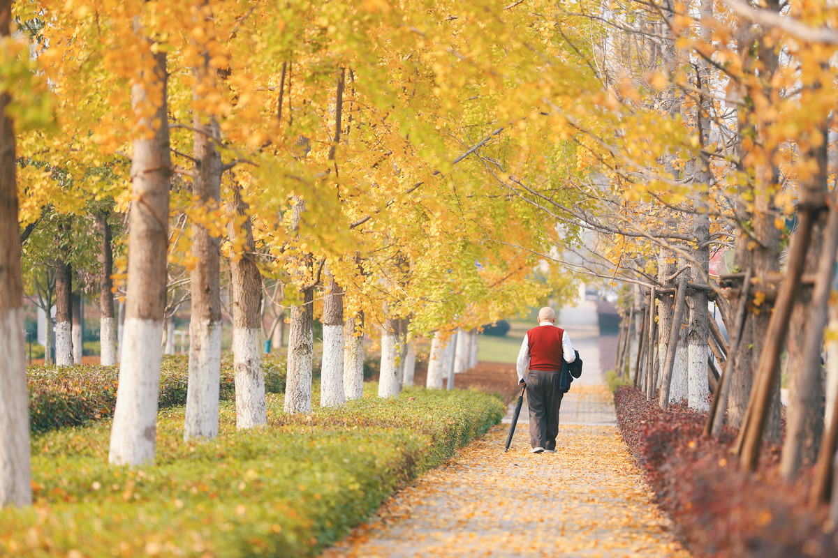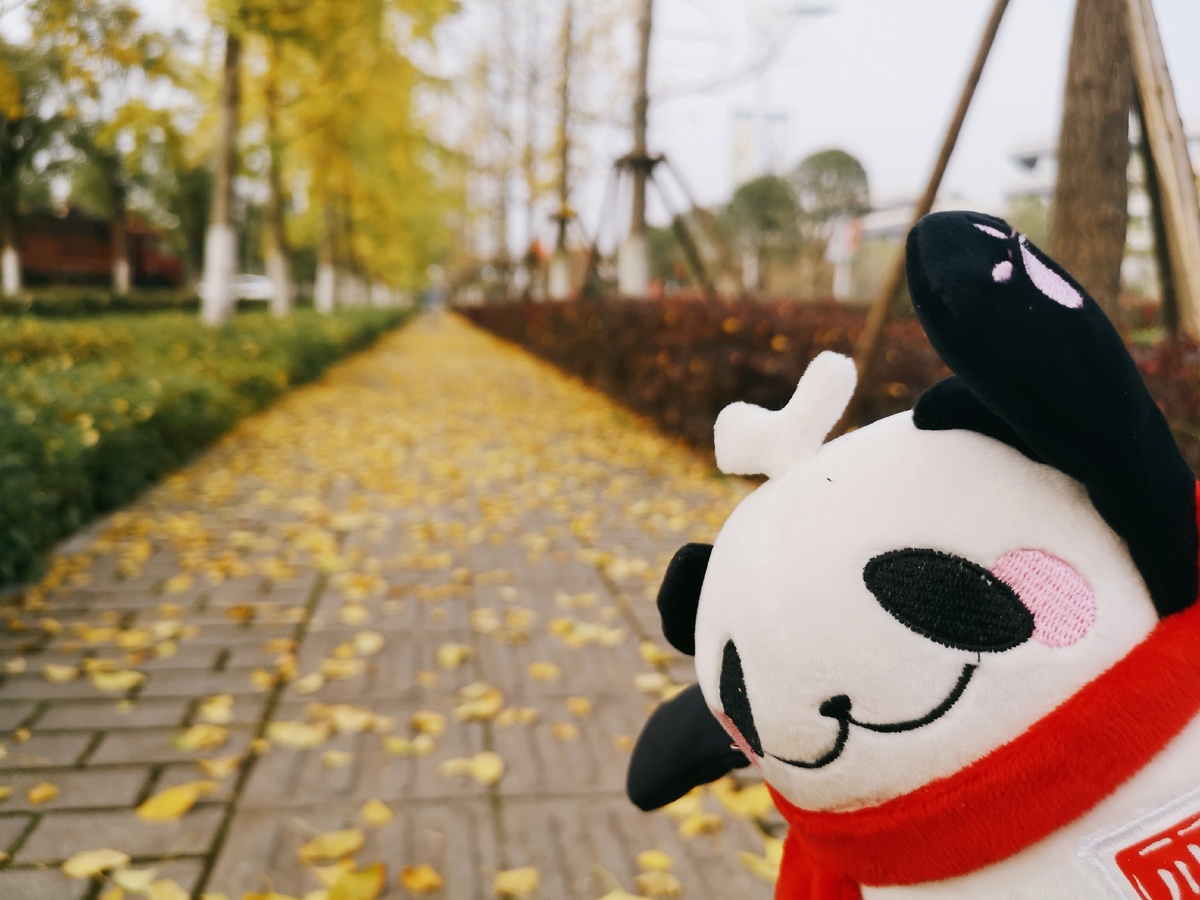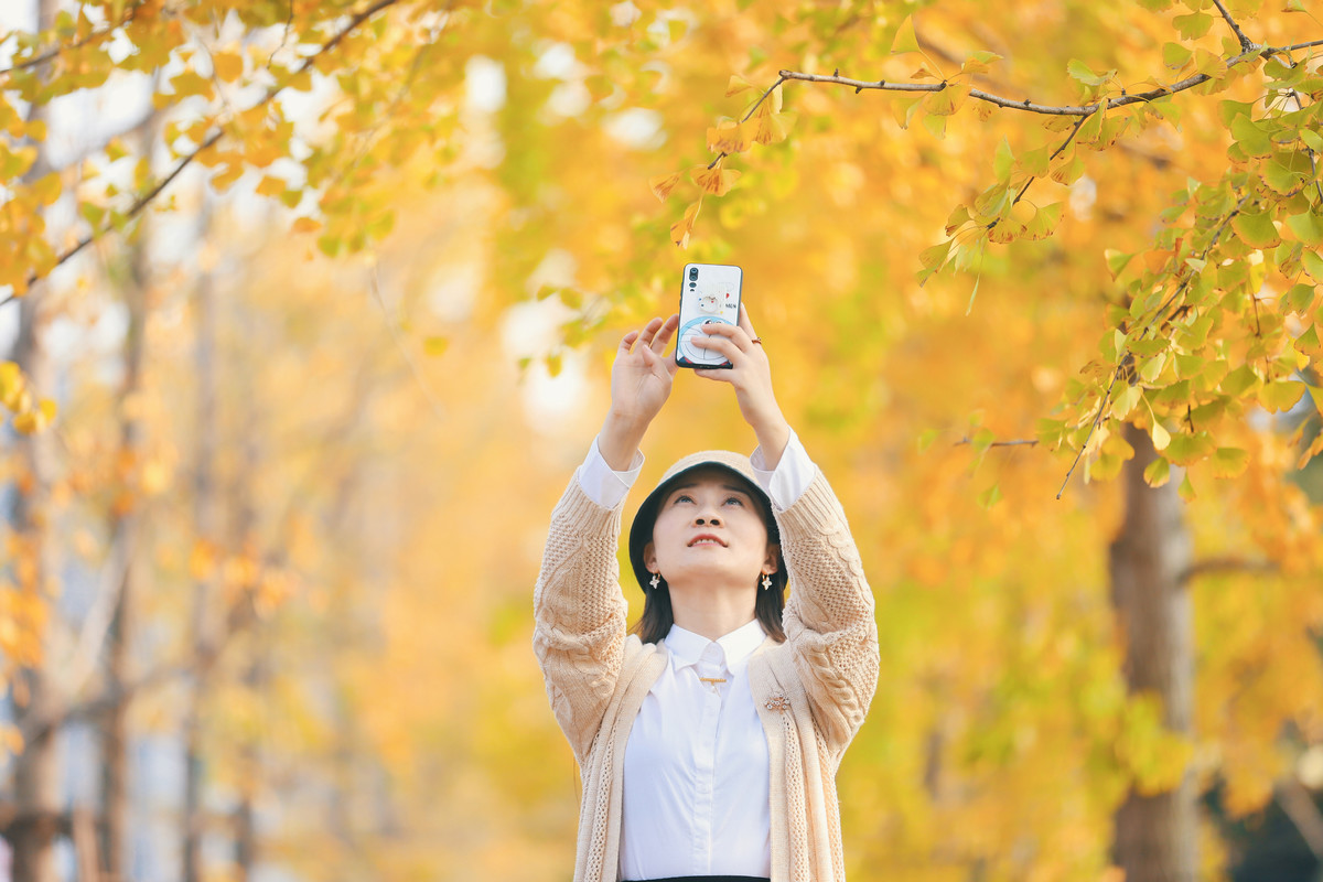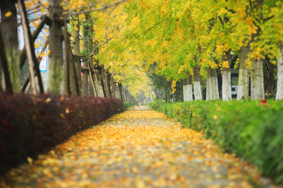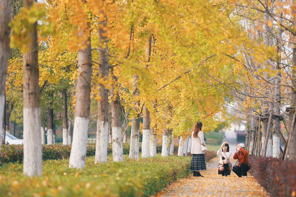 树荫下,叶子随风飘落,铺在地上形成一条金灿灿的大道,仿佛一条“时光隧道”,引来广大市民游客拍照、观赏。