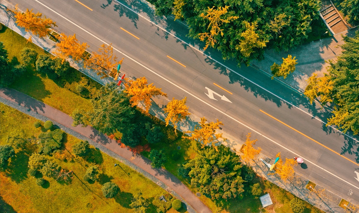 从高空俯瞰,数公里银杏树,点缀着城市,在阳光的照耀下,散发着光芒。