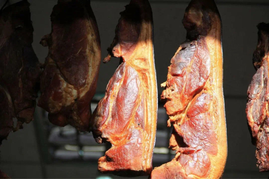峨边腊肉香肠是峨边的传统美食,皮软肉香,色泽金黄,其制作技艺源远流长。峨边腊肉选用产自高山的跑山猪,以就近新采的冬青柏熏制,制作时间跨度长,通常需要二十天以上,步骤繁琐,火候把握以及制作人的技艺等都与腊肉的口感密不可分。