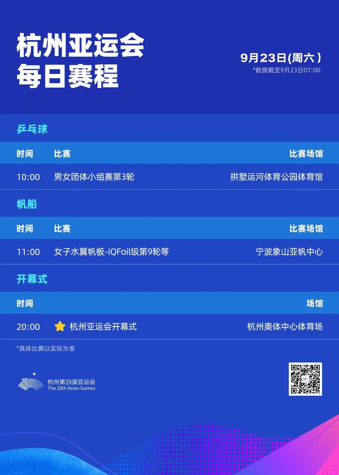9月23日共有2项赛事:帆船、乒乓球。