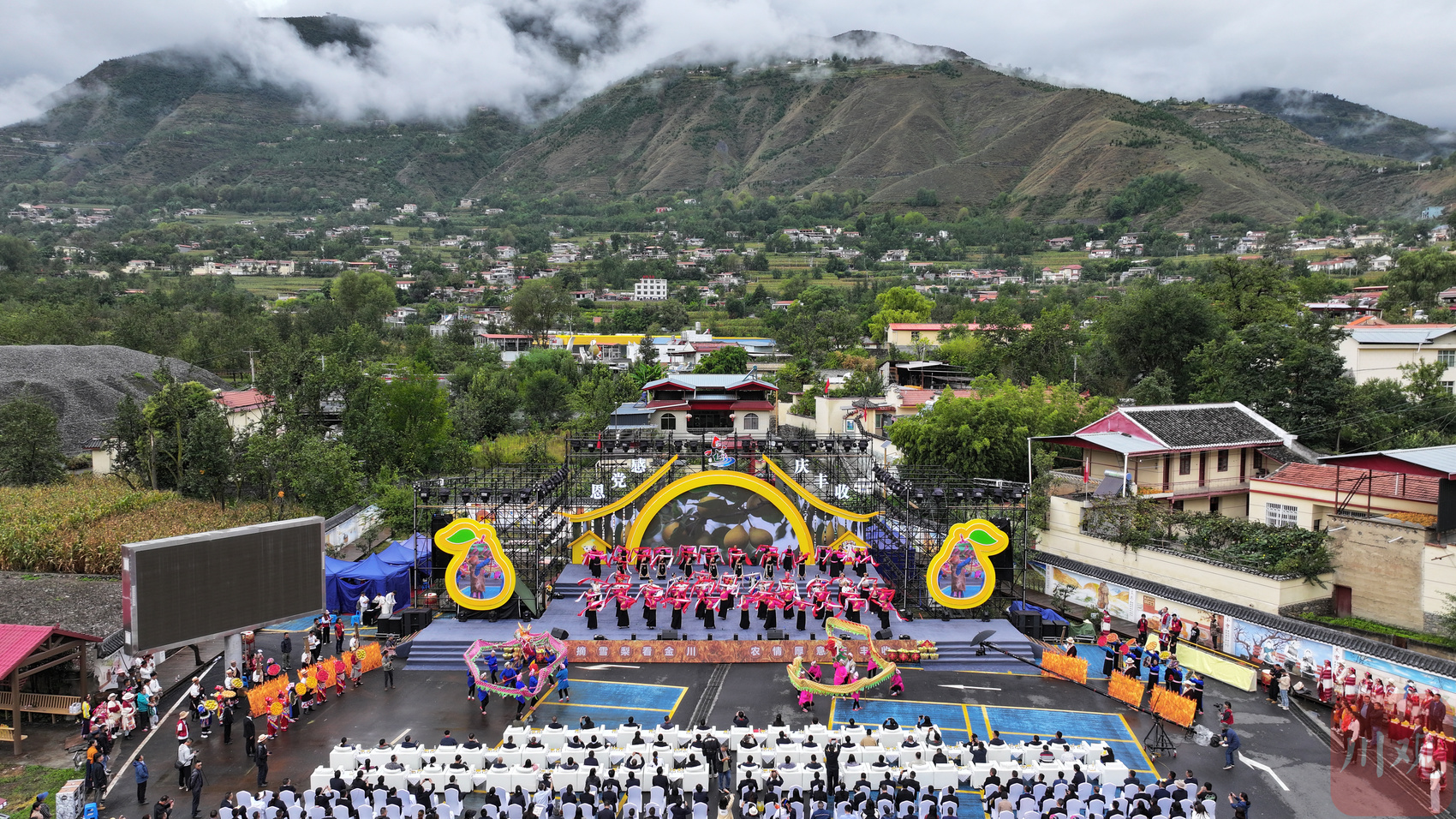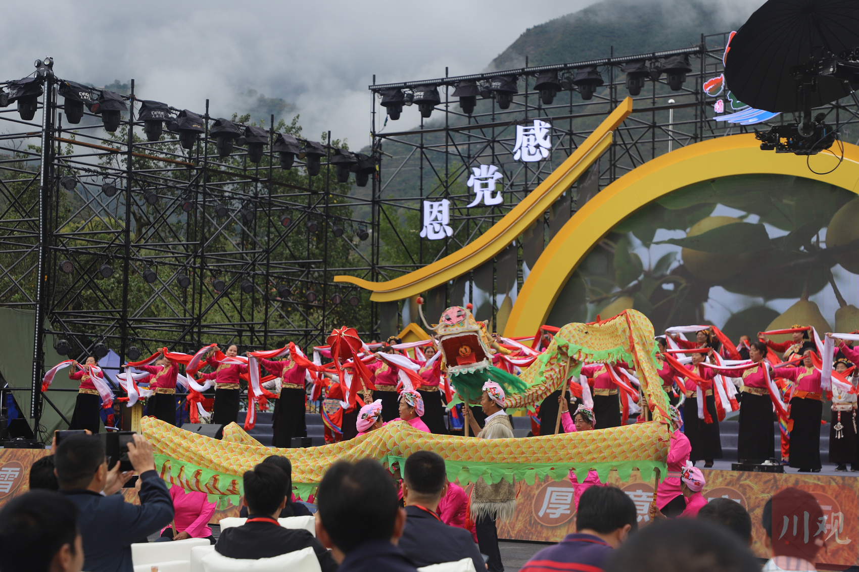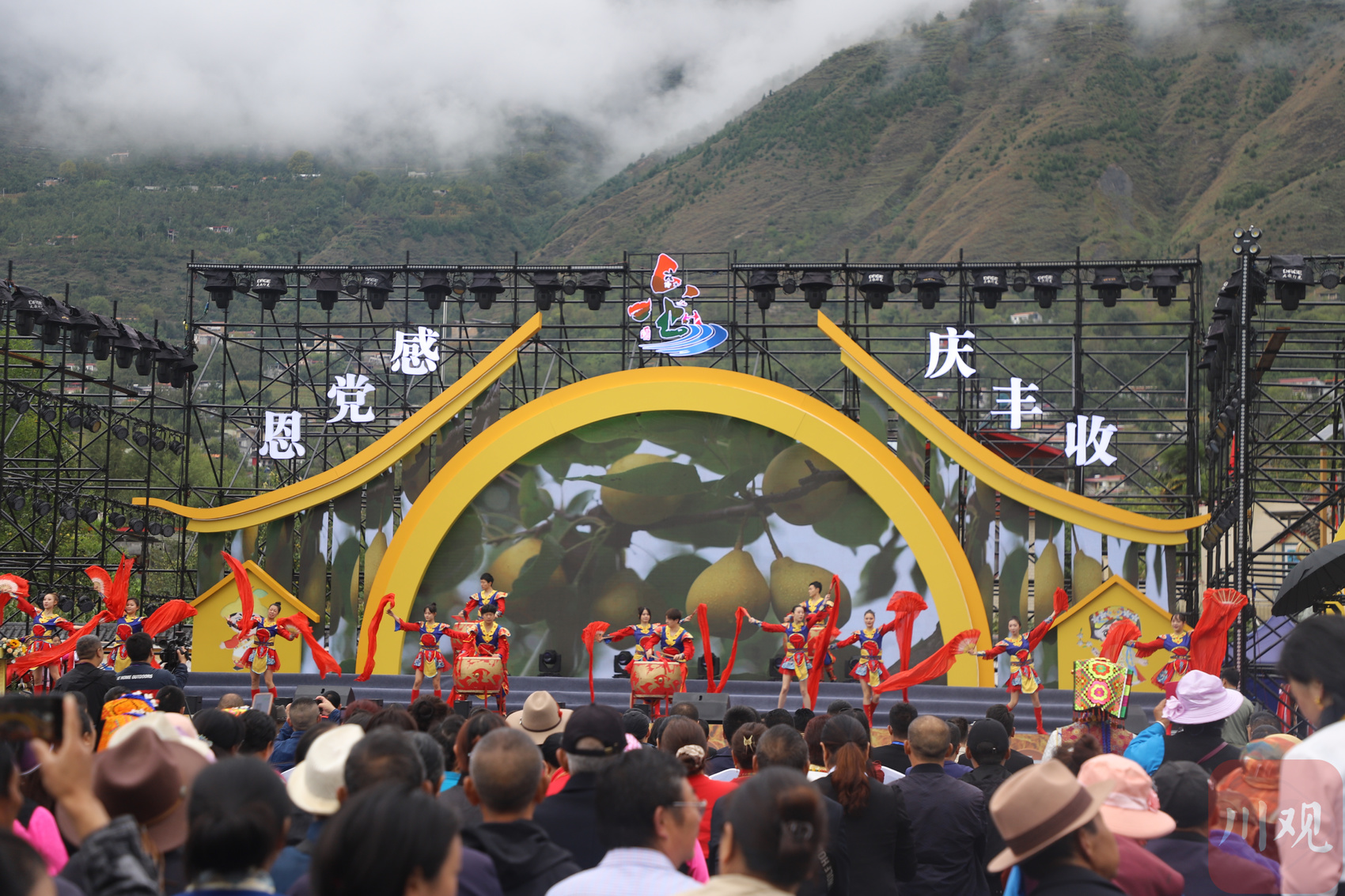 上午9时许,开幕式在开场舞《锦绣梨园》中拉开帷幕,来自金川县各族群众自编自演的歌舞表演《梨树下的嘉绒姑娘》《金川儿女心向党》《金色山川》轮番上演,演职人员身着民族服饰,踏着欢快的旋律,洋溢着热情的微笑,手持背篓、扁担等形形色色的农用器具,将现场观众带入丰收的喜悦氛围中。