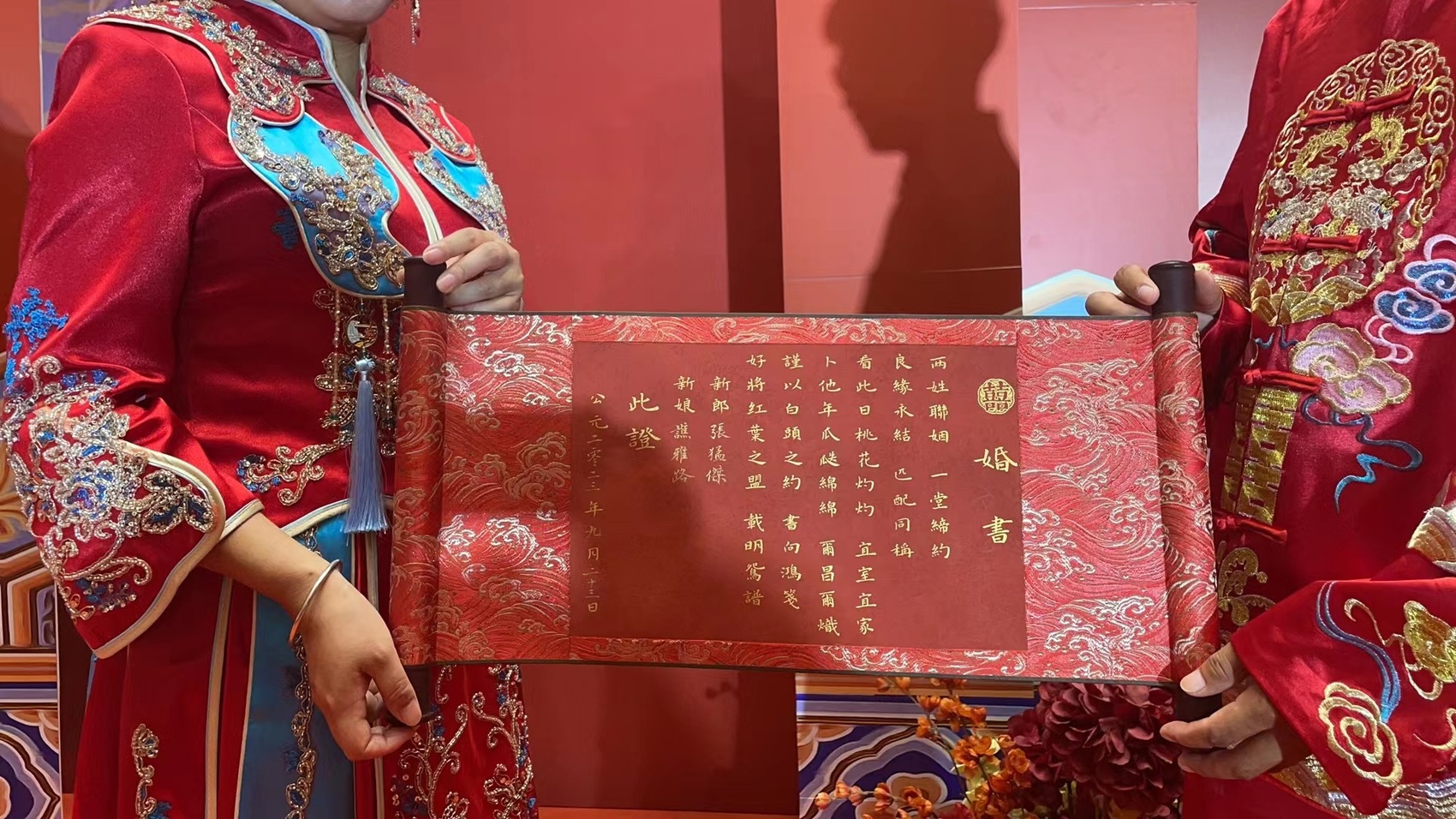 婚礼现场,喜庆庄重、简约温馨、隆重热烈,新人代表们身穿红色中式礼服、凤冠霞帔,在背景墙写下一生的誓言,留下专属的幸福合影,走上象征美满婚姻的红地毯。为展示传统文化特点,活动主办方还精心设计了雀扇礼、交换婚书、合卺礼等中式婚礼仪式,让新人们在沉浸式文化体验中镌刻难忘回忆。