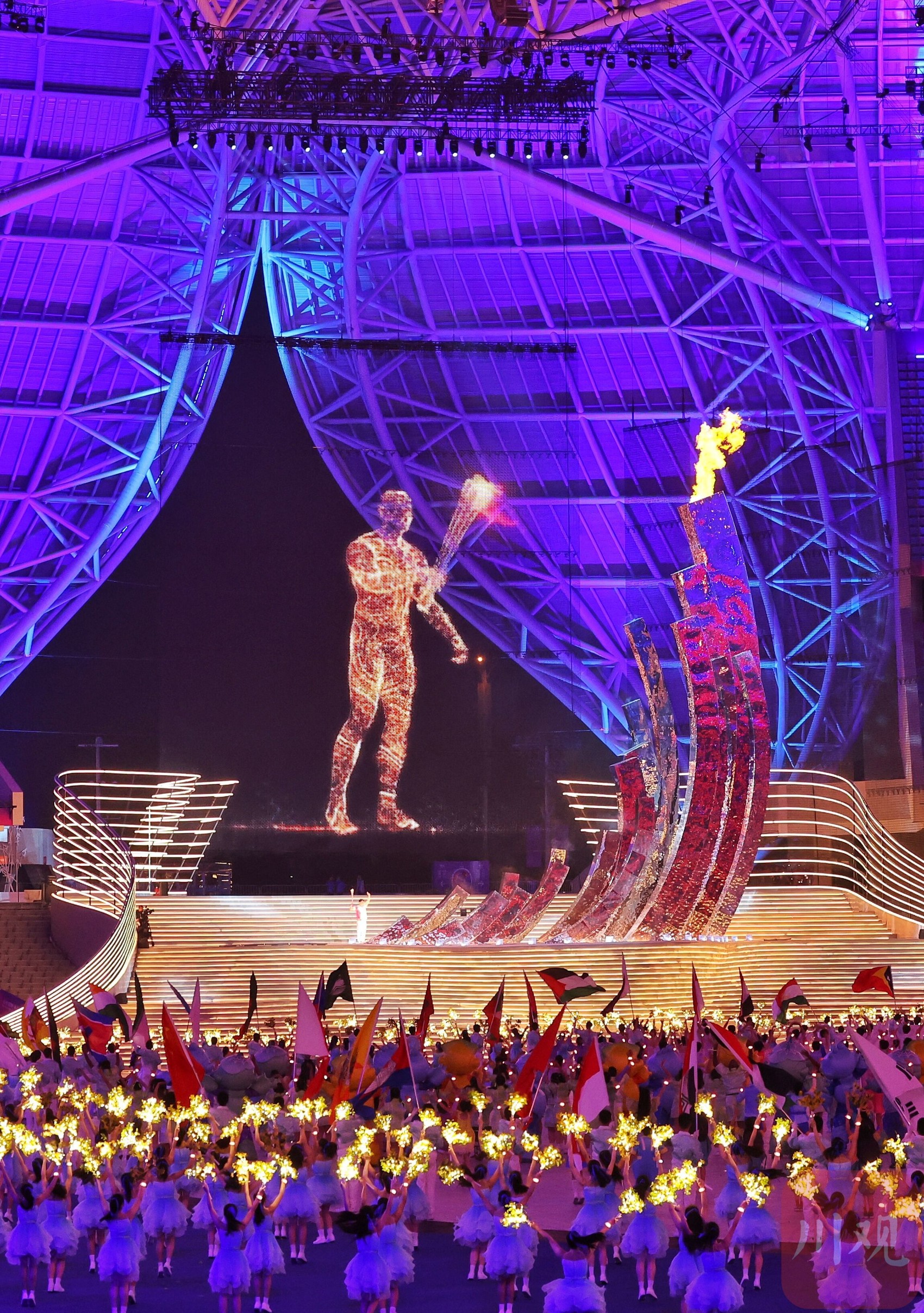 光芒集聚成的数字人从钱塘江上空腾空而起,踏浪来到有着“大莲花”之称的杭州奥体中心上空。随即,数字人来到现场长达185米的立体网幕上。由19根形态各异的立柱排列组合而成,浪花造型的主火炬由闭合状态徐徐展开,迎接圣火的到来。汇聚了全亚洲人民的共同祝福,数字人和最后一棒火炬手、游泳奥运冠军汪顺一起在现场点燃主火炬,象征着数字世界与现实世界同频共振,表达共建亚洲命运共同体的美好愿望。