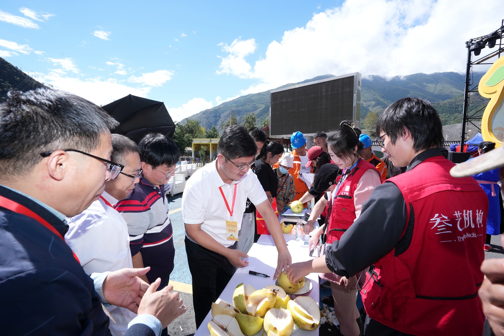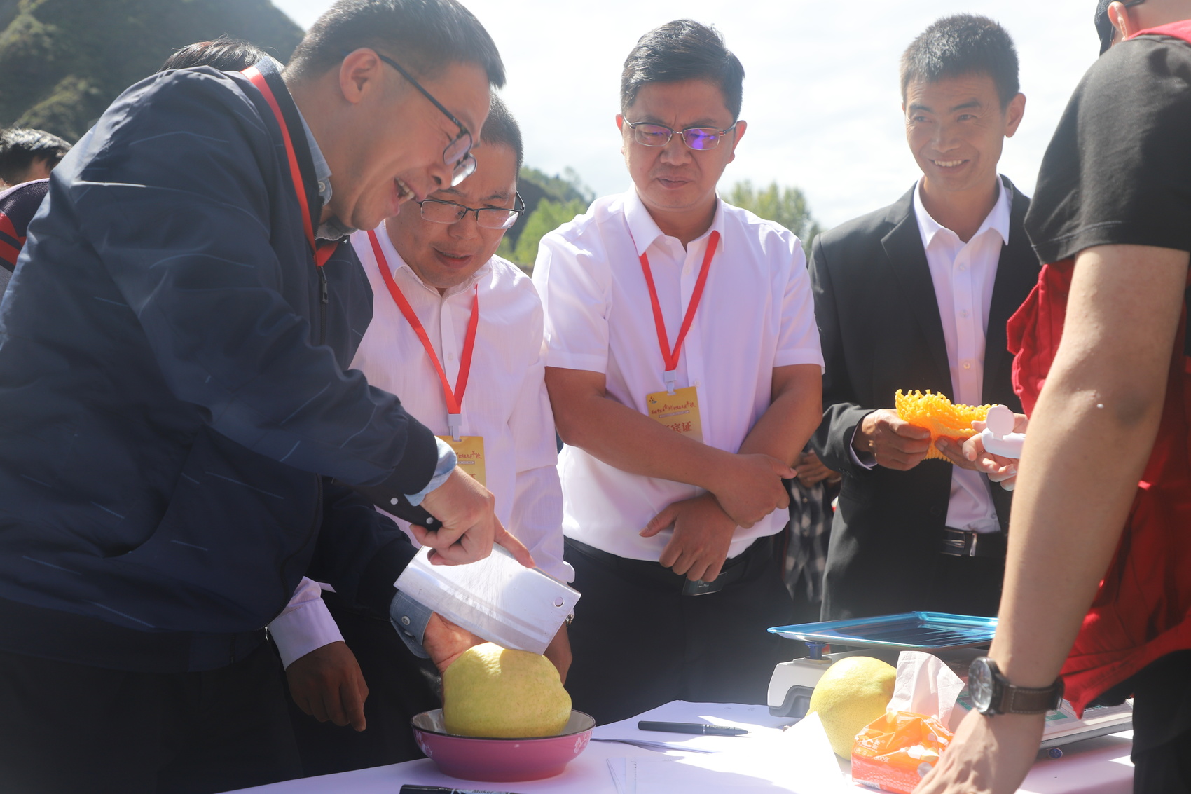 活动现场,二十余位参赛选手手捧个头“赛柚子”的梨排队等候。参赛选手将自己精挑细选的梨放至电子秤上,最后经由五位评委老师按重量、光泽度等条件评判后,再将其切开检测甜度,一部分用以测评品尝。