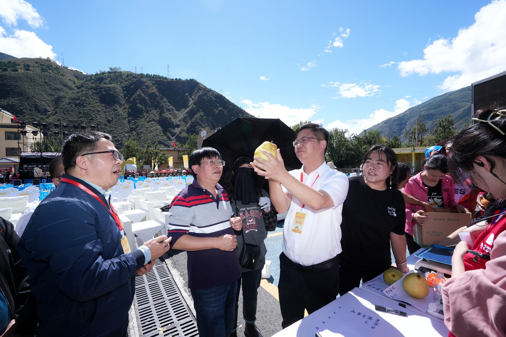 评委们手捧参赛梨端详。金川县委宣传部供图