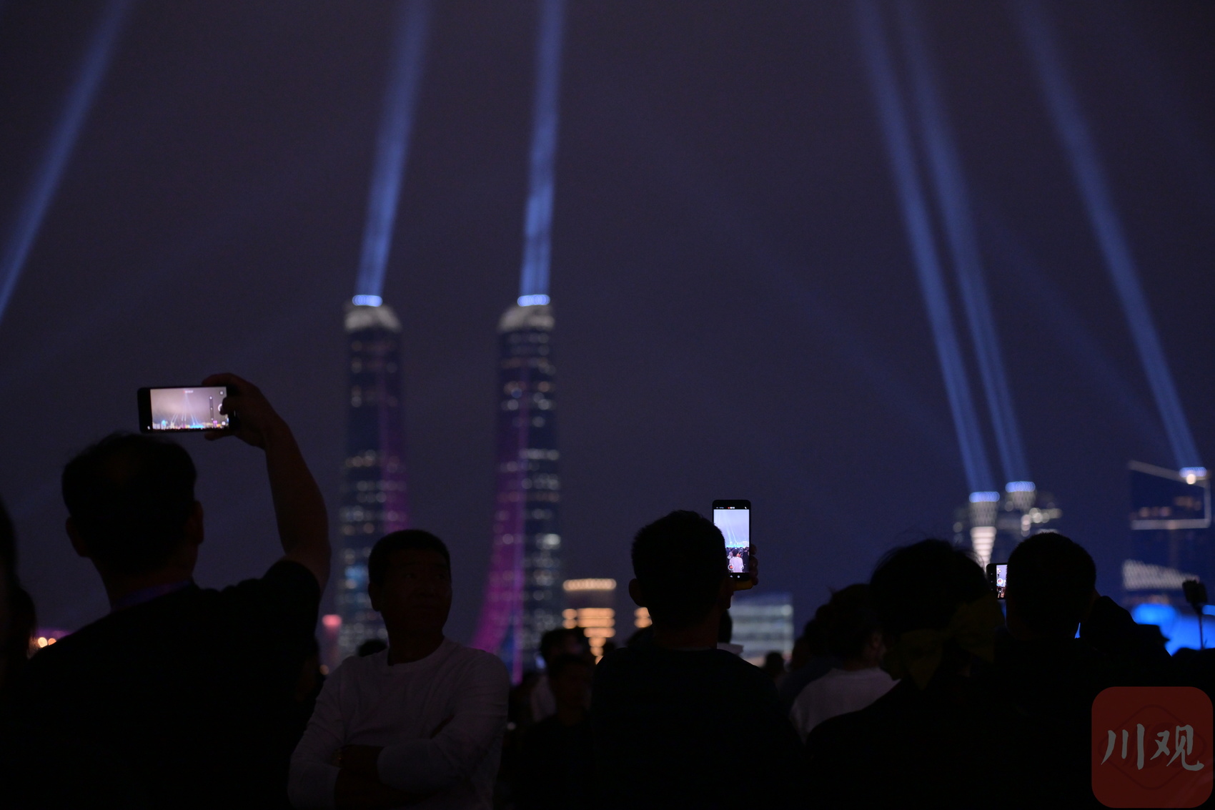 9月23日晚,杭州城市阳台观景台,市民游客在钱塘江畔观看亚运灯光秀。
