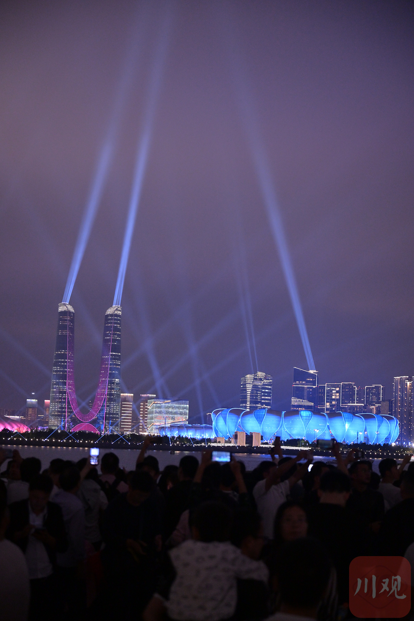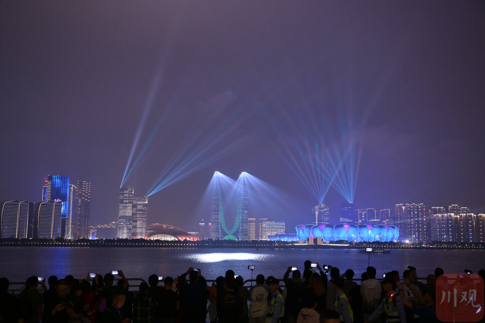 随着杭州第19届亚洲运动会开幕,杭州奥体中心场馆熠熠生辉,璀璨夺目的灯光秀吸引市民游客在钱塘江畔观看,将亚运的氛围拉满。