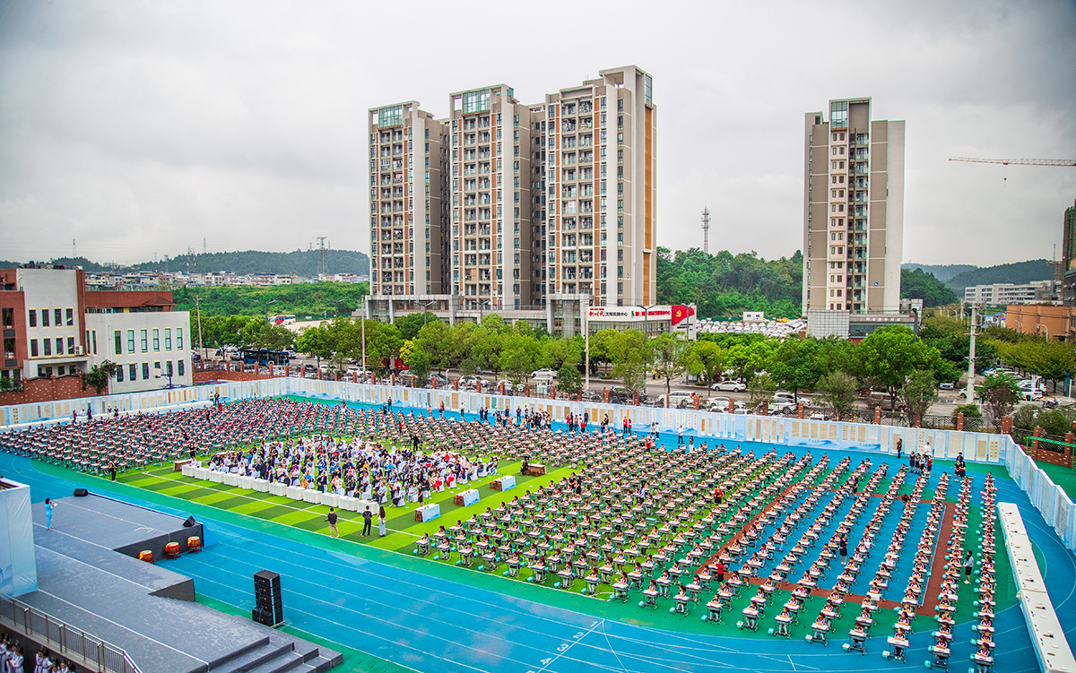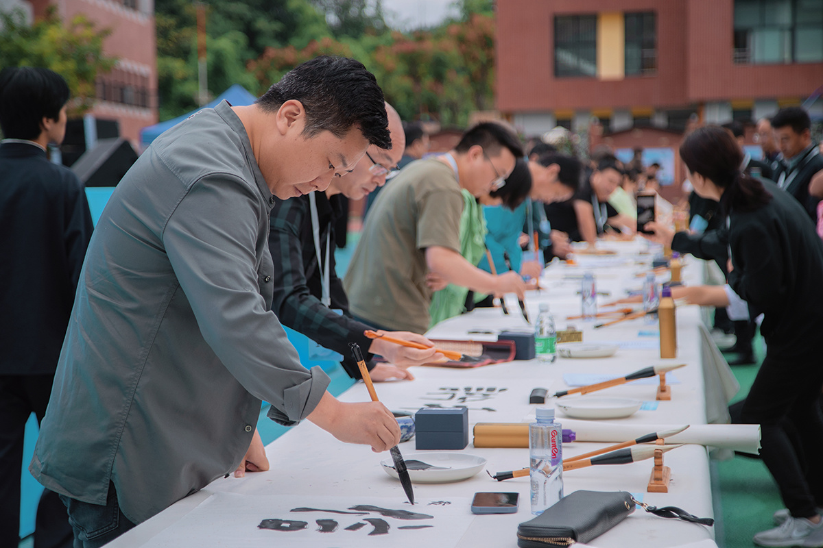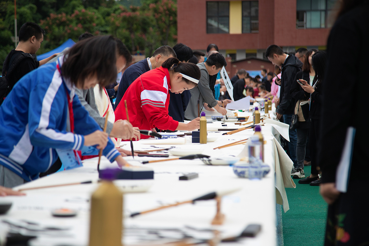 上午10时许,参与活动的四川各市州书法名家、传习导师和同学们走到台前,现场即兴泼墨、挥毫抒情。绵阳高新区火炬二小学生在操场整齐排列的小课桌上,拿出笔墨纸砚,开始千人临帖,在运动着的线条间感受传统文化的美。
