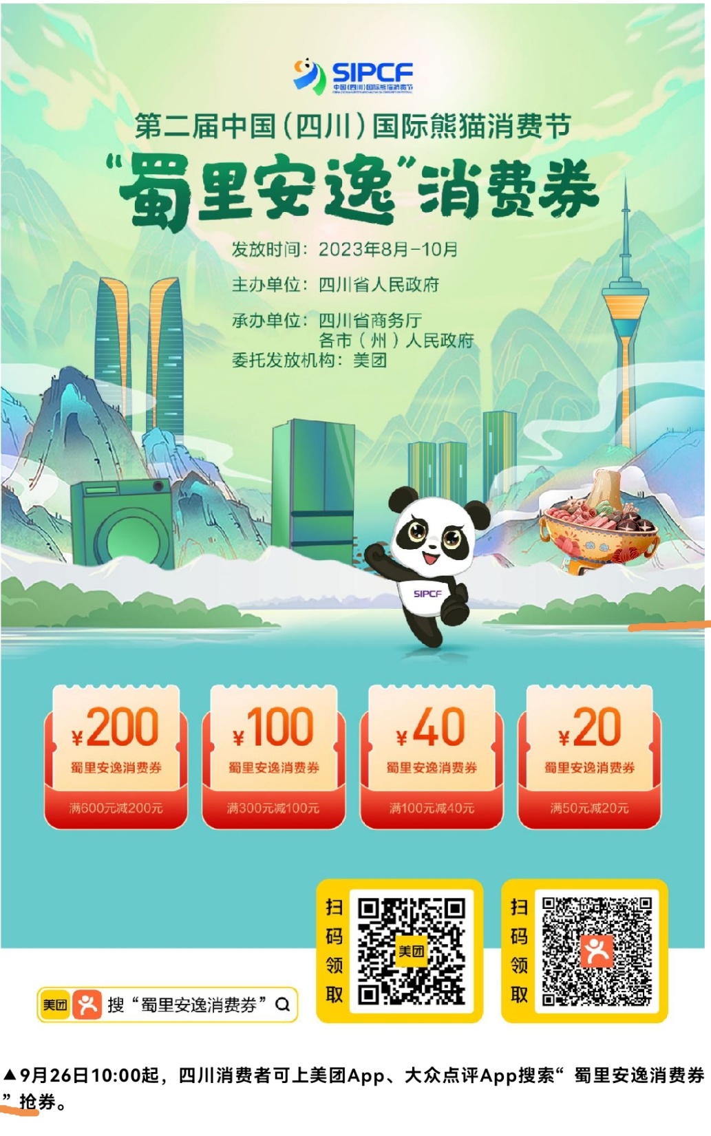 为喜迎中秋、国庆“双节”到来,9月26日(星期二)上午10:00,四川将继续发放第二届中国(四川)国际熊猫消费节“蜀里安逸”消费券。