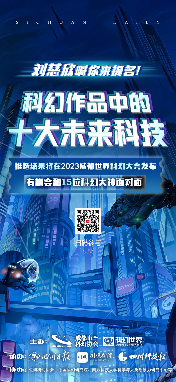 即日起至10月6日,公众可下载川观新闻客户端参与,提交自己的提案。我们将在2023成都世界科幻大会上公布评选结果。入围一等奖的提案人将有机会在2023成都世界科幻大会上,与科幻大神面对面!
