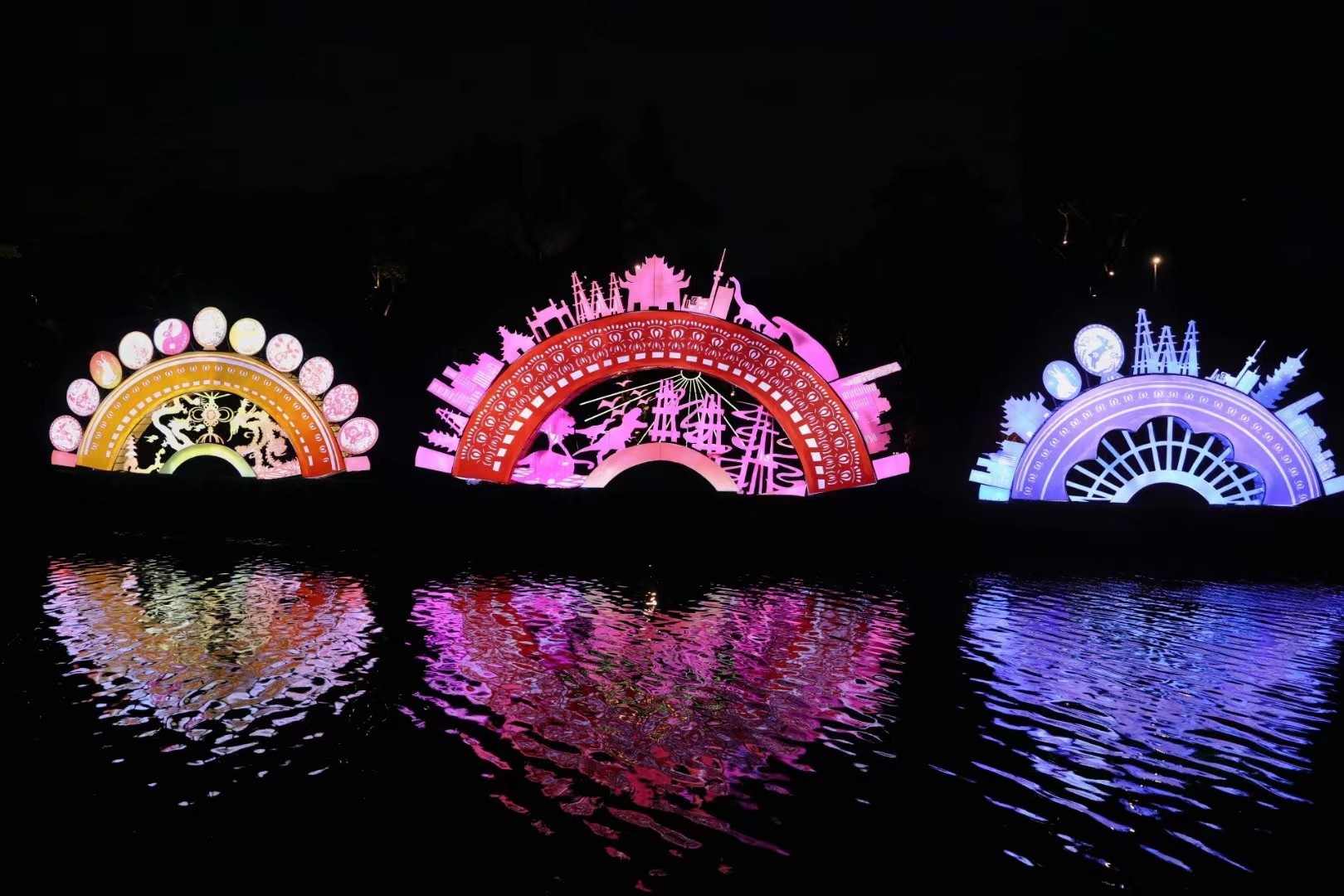 坐在画舫之上,半城青山半城楼、彩灯辉映碧水流的悠然之美一览无余。沿河两岸的灯组、光影秀及亮化景观呈现出“盐史灯廊”美景:两岸灯阵构成灯海,展示自贡“盐文化”主题;王爷庙等几处的裸眼3D光影秀,与系列灯组交相辉映,实现虚拟世界与现实世界之间的无缝转换。