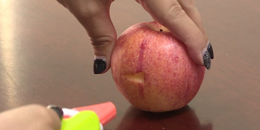 有几款萝卜刀虽然是塑料材质,但是尖头处很硬,稍微用力便能插破白纸,扎入苹果。