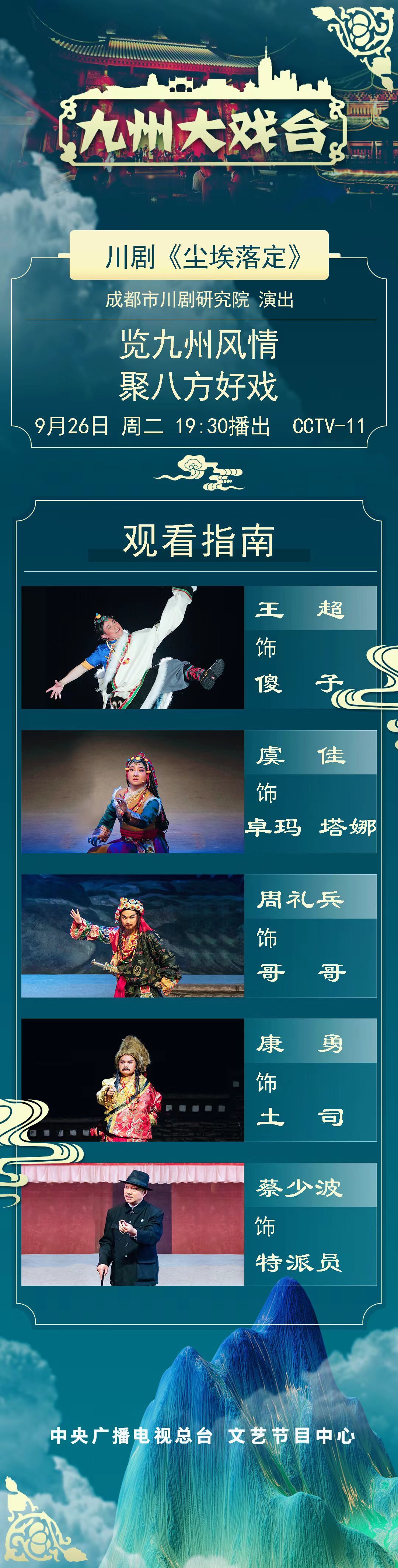 9月26日19:30,2023年四川省首届川剧汇演集中展演优秀剧目展播第二部剧将亮相CCTV-11《九州大戏台》栏目,将播出由成都市川剧研究院出品的川剧《尘埃落定》。这部作品由国家一级演员、中国戏剧梅花奖获得者王超、虞佳领衔主演,改编自著名作家阿来的同名获茅盾文学奖的长篇小说。