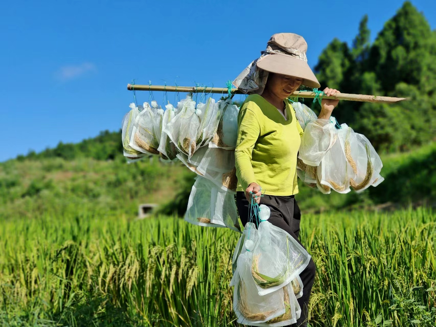 细心挑选出主穗,装在一个小小的白色透气的麻布口袋,再进行独立编号,剩下的分穗再统一收割,装在一个较大的白色透气的麻布口袋,再进行编号……走进试验田,一株株颗粒饱满、沉甸甸的稻穗随风摇曳。在昭化区特优粮油首席专家陈定全的指导下,实验基地抢正抓晴好天气,组织人力对成熟的水稻进行收割。