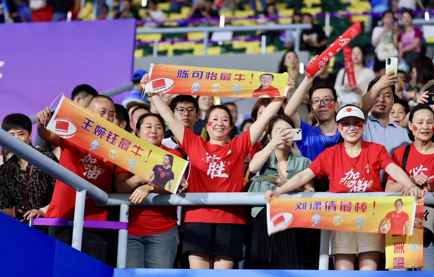 比赛结束之后,她特意手捧鲜花来到观众席与家人合影。此次杭州亚运会,中国七人橄榄球女队队员的家人自发组成了一个亲友助威团,他们中年龄最大的“队员”是陈可怡71岁的外公,外婆也有70岁了,身穿助威团统一的红色服装,两位银发老人神采奕奕。作为这次助威团的“团长”、陈可怡的妈妈李绍兰每次有中国队出场时,她都站在最高处大喊“中国”,得到整座球场的回应:“加油!”陈可怡的弟弟目前在广东上大学,此次也专程前来杭州,为姐姐加油。李绍兰说:“因为她们要打比赛,这次又在家门口,所以比较有压力,我还没有顾得上见她一次。现在可怡很少回家了,一年就回来一两次,在家里待一周都算多的。正好趁这次机会来看看她。”