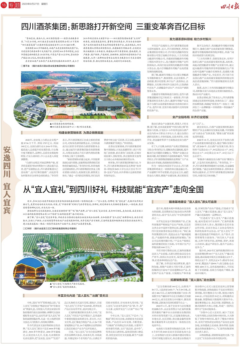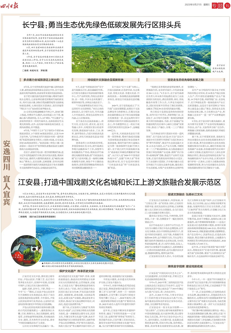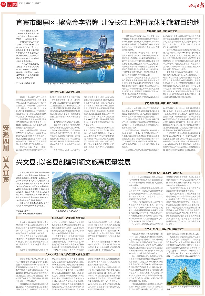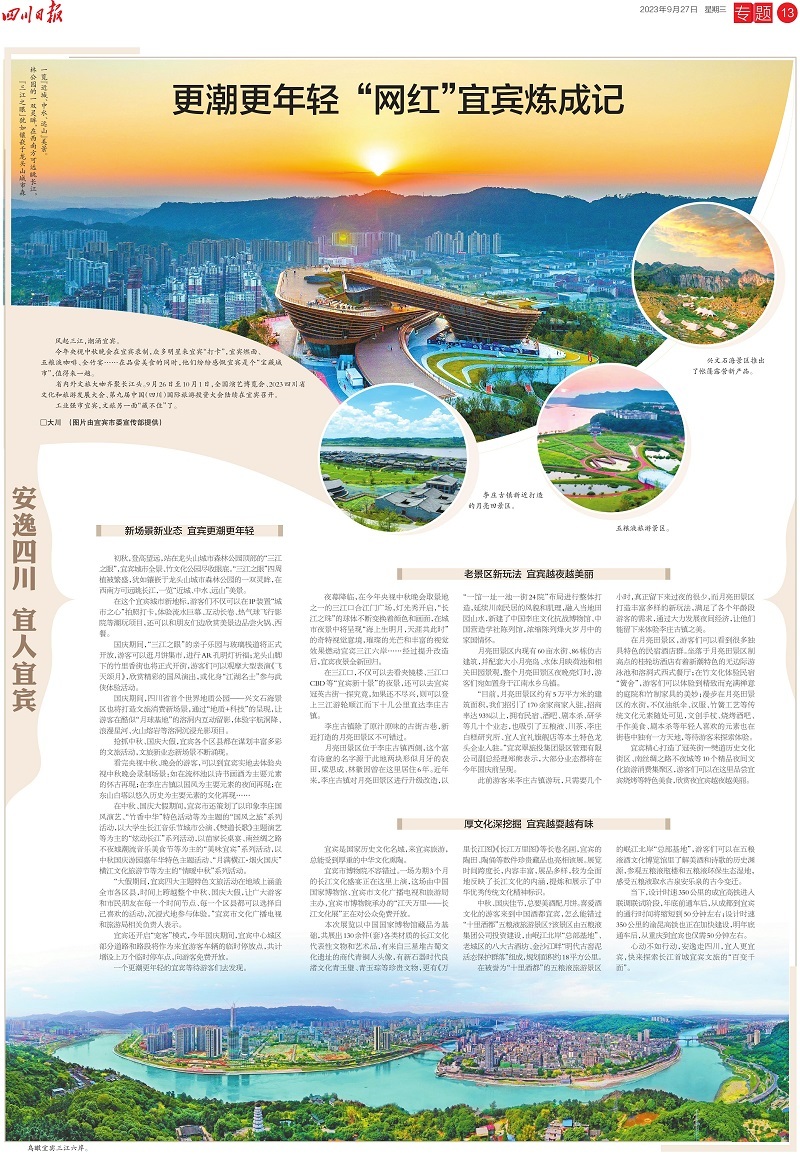 安逸四川、宜人宜宾。9月27日,2023四川省文化和旅游发展大会在宜宾市召开。今天,《四川日报》四个整版关注宜宾文旅产业发展,从全市出发,辐射天府旅游名县翠屏区、兴文县、长宁县、四川省曲艺之乡江安县以及四川酒茶集团和三江汇海等涉旅龙头企业,以美食、美景、好茶、好礼、新业态新玩法等多维度为切片,展示了“长江首城”宜宾这座宝藏城市不断迸发出的生机与机遇,探究“网红”宜宾练成之路。