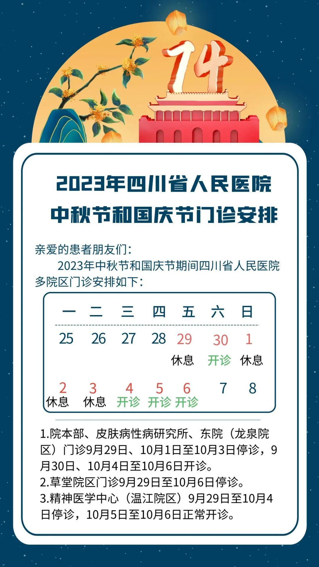根据《国务院办公厅关于2023年部分节假日安排的通知》(国办发明电(2022)16号)文件精神,结合医院实际情況,医院门诊中秋、国庆放假安排:2023年9月29日(星期五)、10月1日(星期日)、10月2日(星期一)、10月3日(星期二)华西坝院区和温江院区门诊(包括门诊采血及相关辅助检查科室)停诊4天。门诊停诊期间,急诊、线上门诊照常运行。